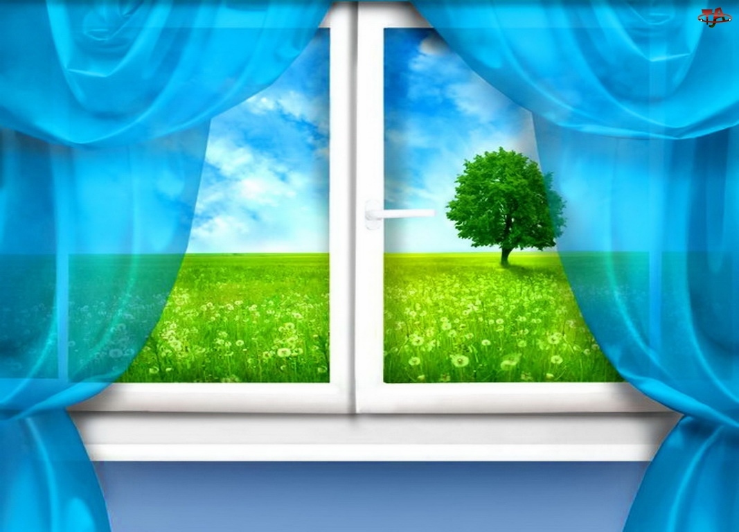 Zasłony, Okno, Drzewo, Łąka, Niebieskie