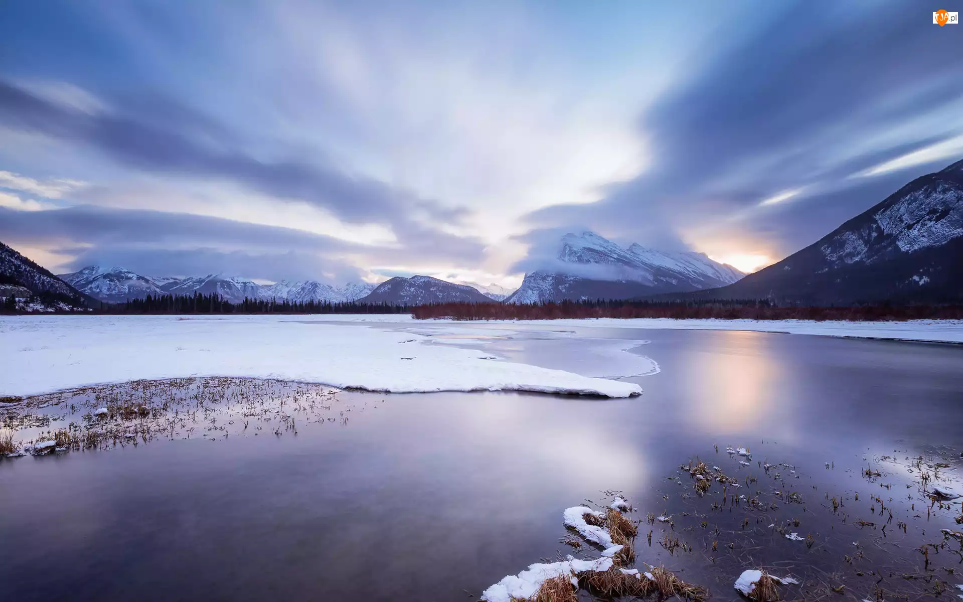 Góry, Śnieg, Stan Minnesota, Stany Zjednoczone, Wschód słońca, Jezioro Vermilion, Chmury