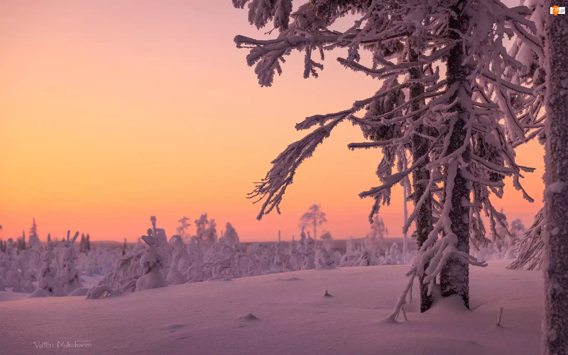 Zaśnieżony, Zachód słońca, Drzewa, Zima, Las