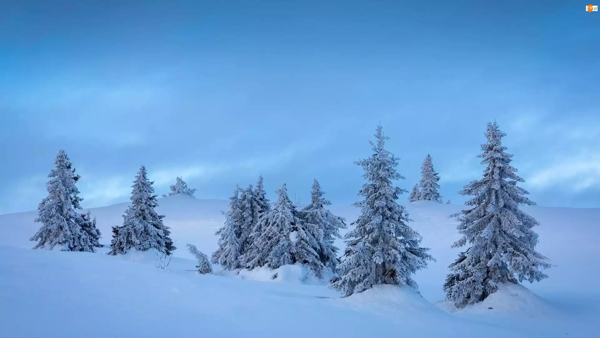 Skały, Drzewa, Góry, Zima, Ośnieżone