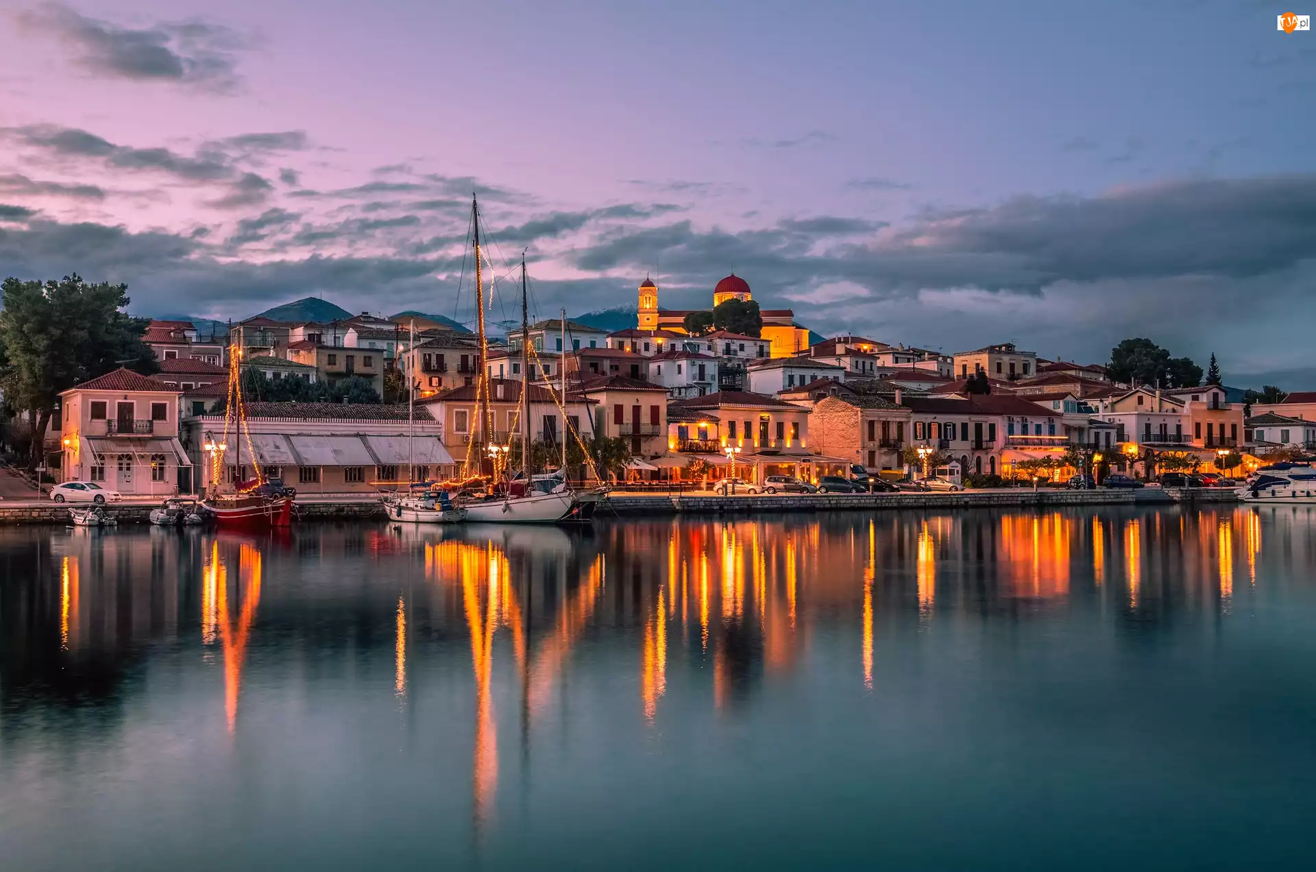 Zatoka Koryncka, Domy, Grecja, Morze, Galaxidi, Oświetlone, Żaglówki