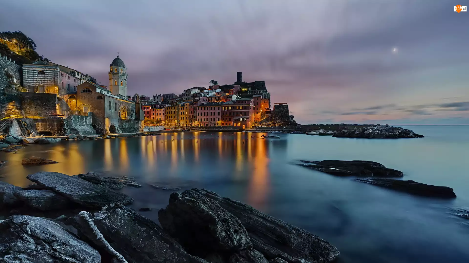 Zatoka, Włochy, Vernazza, Skały, Prowincja La Spezia, Morze Liguryjskie, Wschód słońca, Domy