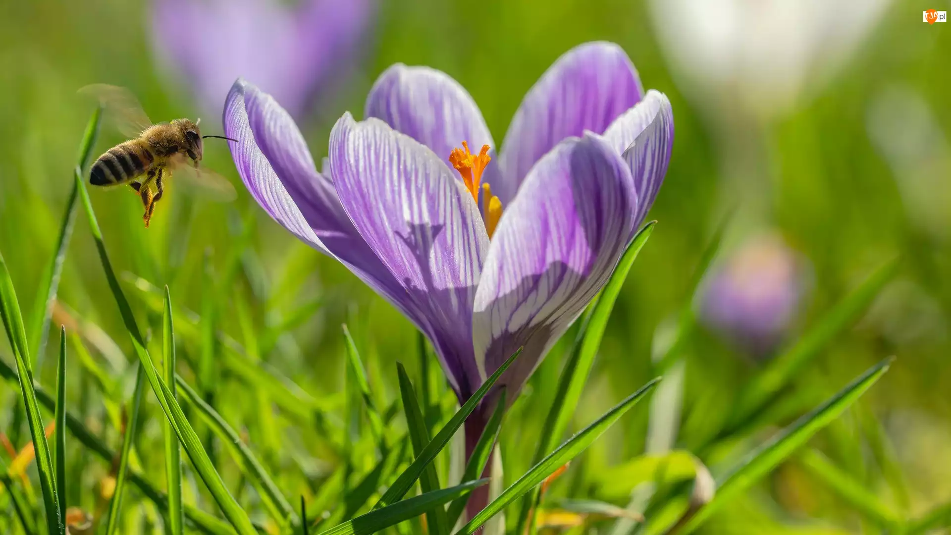 Zbliżenie, Pszczoła, Fioletowy, Krokus, Trawa