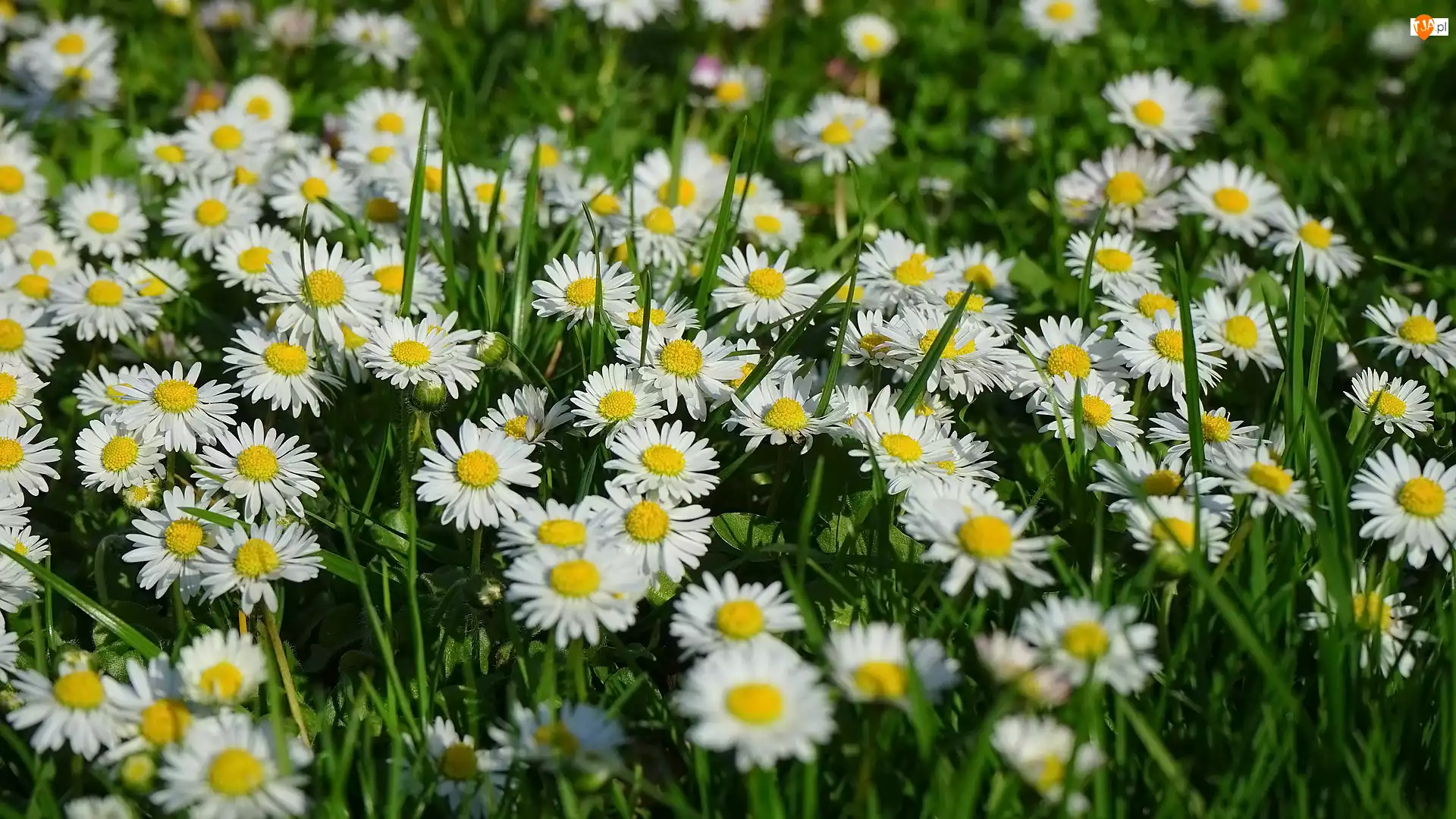 Źdźbła, Kwiaty, Stokrotki, Trawa