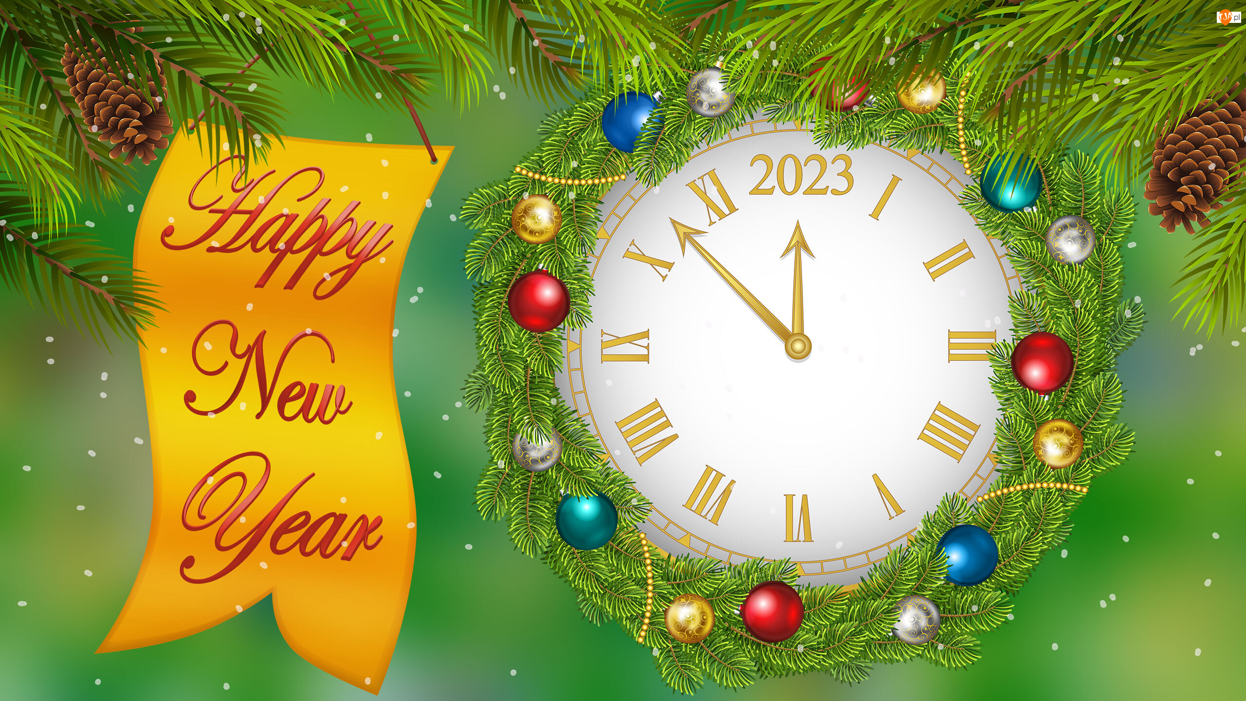 Zegar, 2D, Życzenia, Nowy Rok, Szyszki