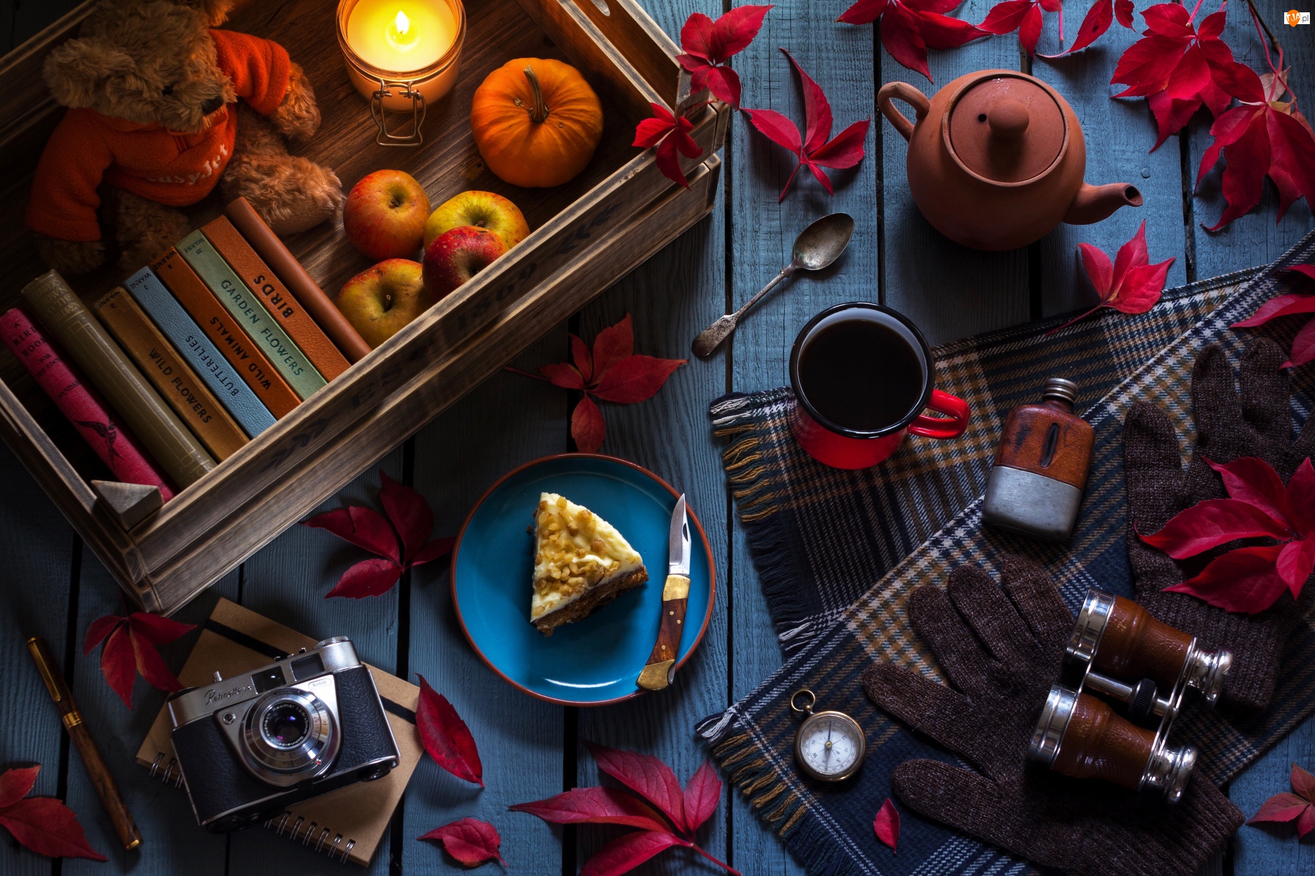 Talerzyk, Książki, Liście, Imbryk, Jesienna, Deski, Ciasto, Herbata, Lornetka, Jabłka, Kompas, Kompozycja, Kubek, Dynia, Aparat fotograficzny