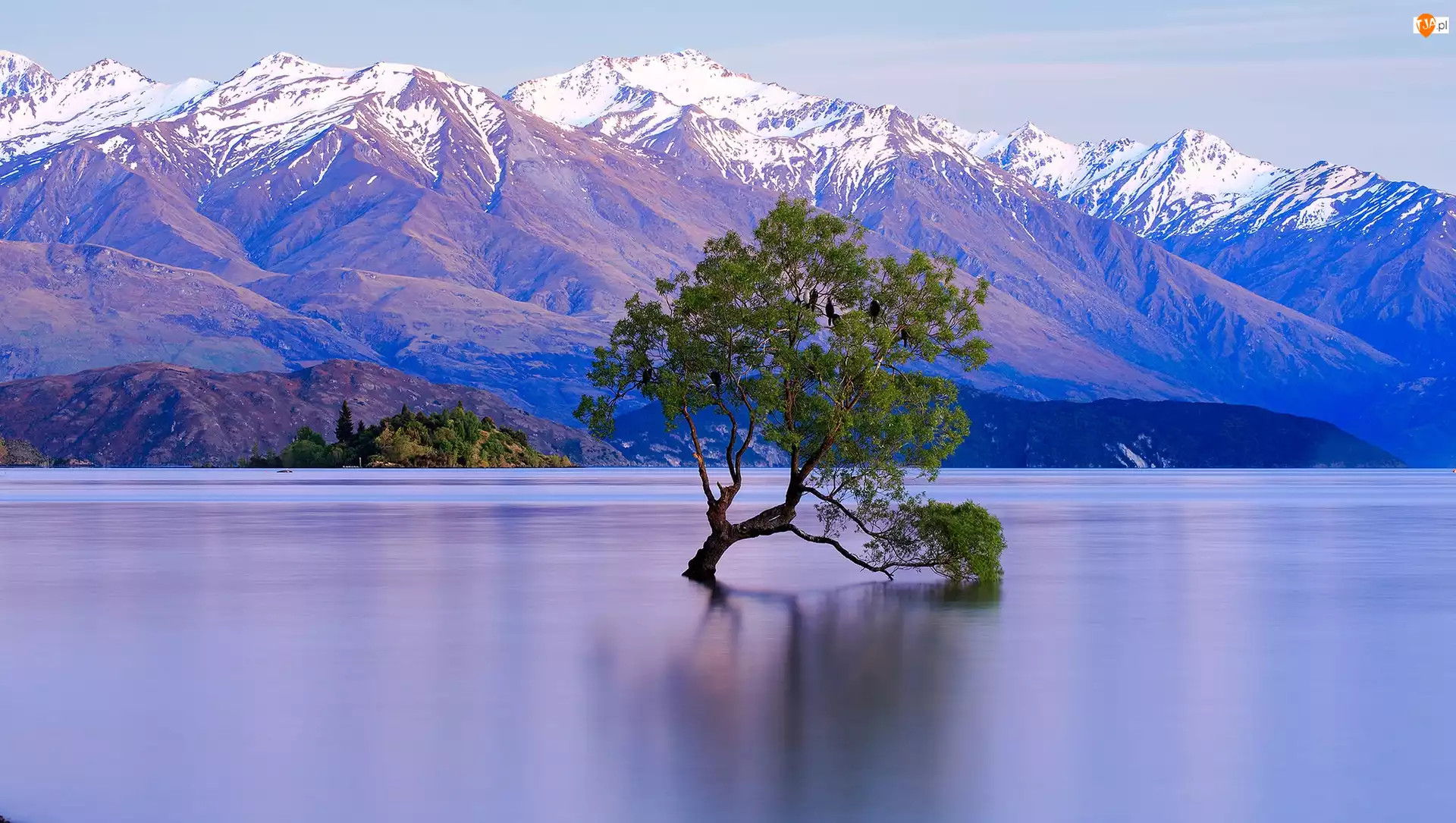 Góry, Drzewo, Nowa Zelandia, Jezioro Wanaka, Śnieg