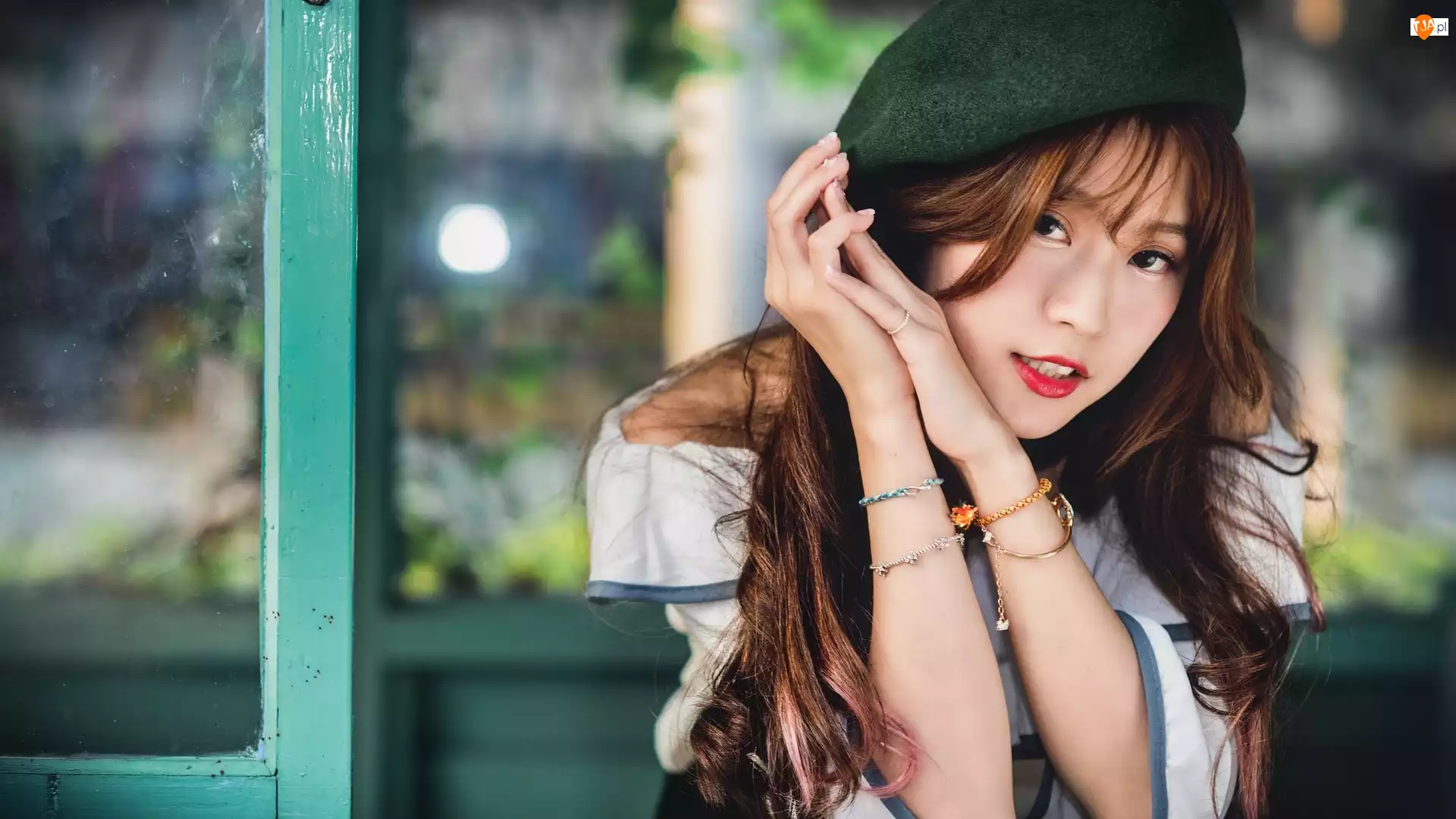 Zielony, Okno, Azjatka, Dziewczyna, Beret