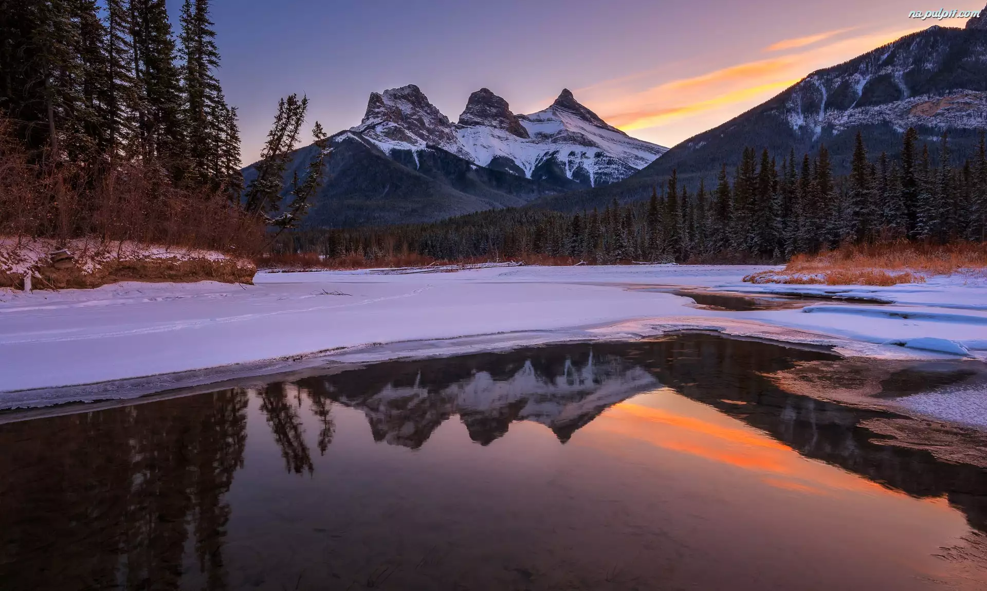 Zima, Alberta, Drzewa, Rzeka, Bow River, Góry, Canadian Rockies, Kanada, Góra Three Sisters