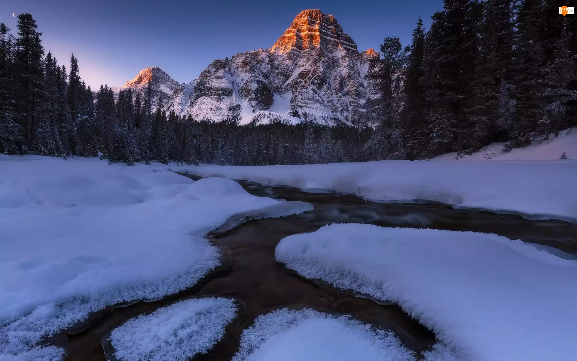 Zima, Alberta, Rzeka, Mount Chepren, Drzewa, Park