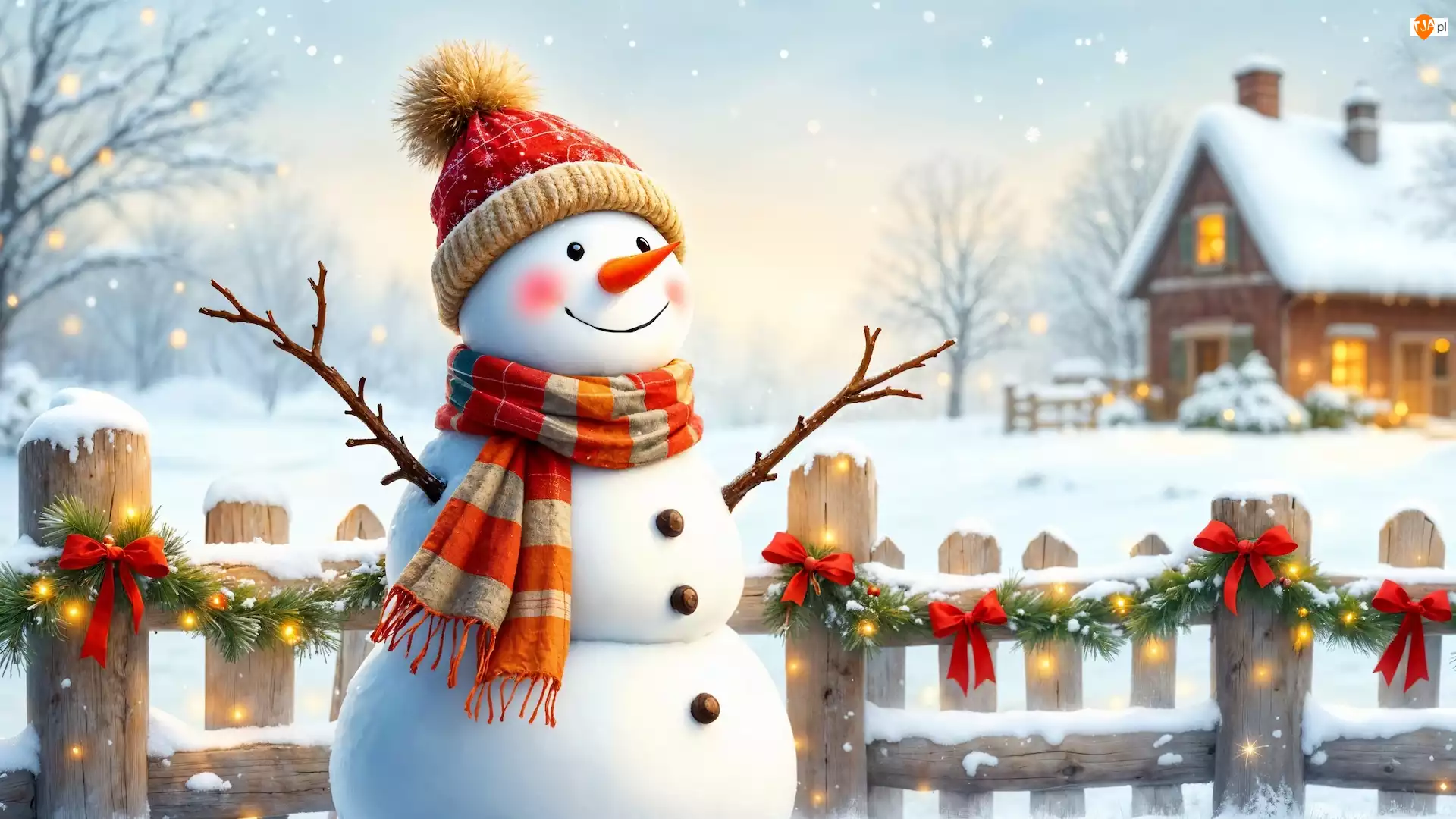 Zima, Bałwan, Płot, Grafika, Dom, Dekoracja