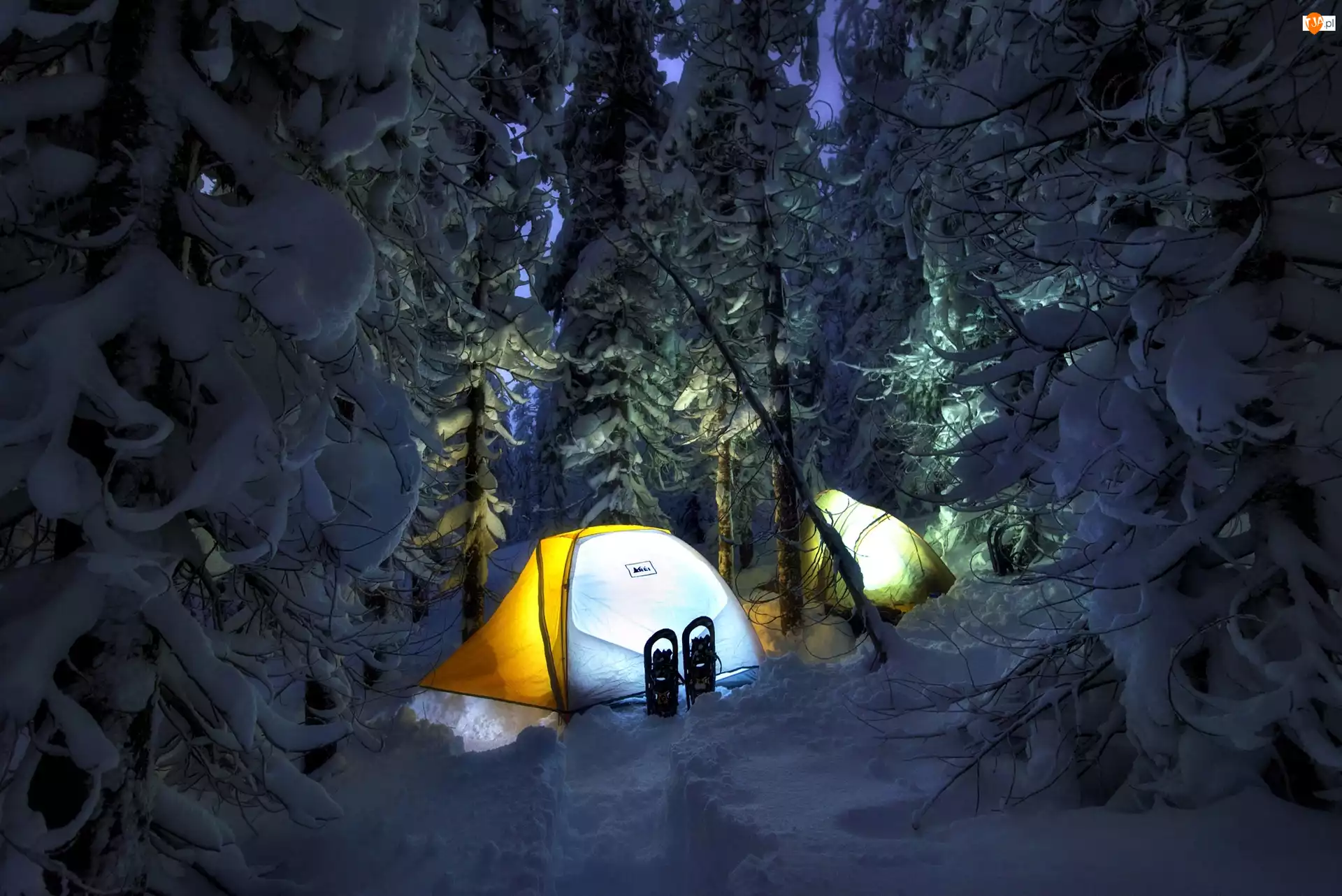 Zima, Biwak, Las, Oświetlone Namioty