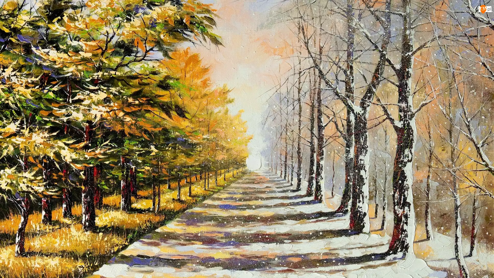 Zima, Drzewa, Malarstwo, Park, Obraz, Jesień