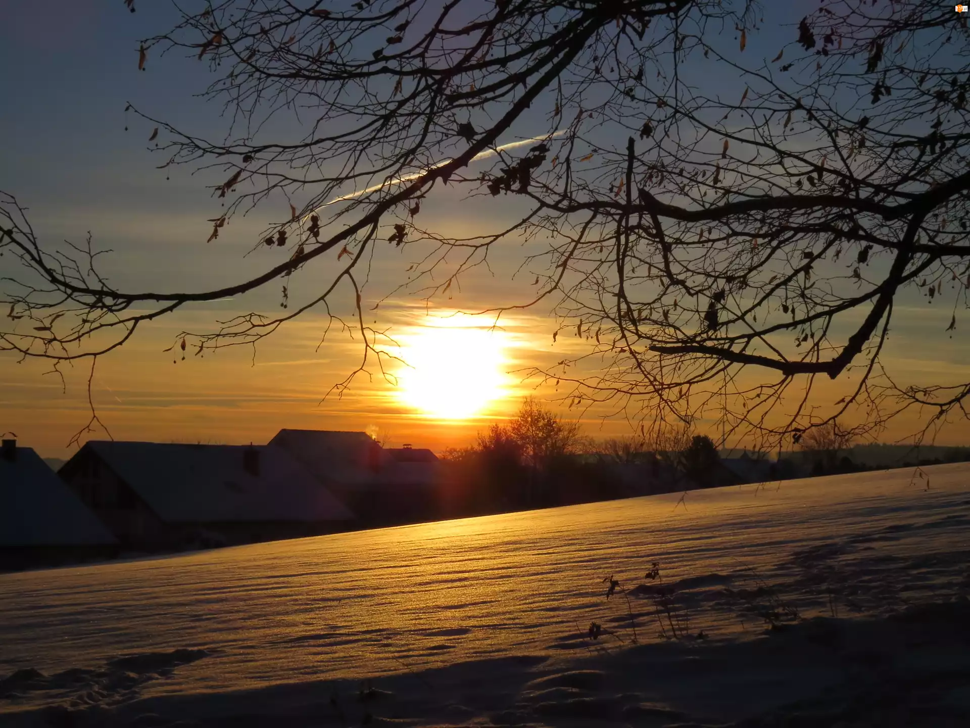 Zima, Drzewo, Zachód słońca , Domy