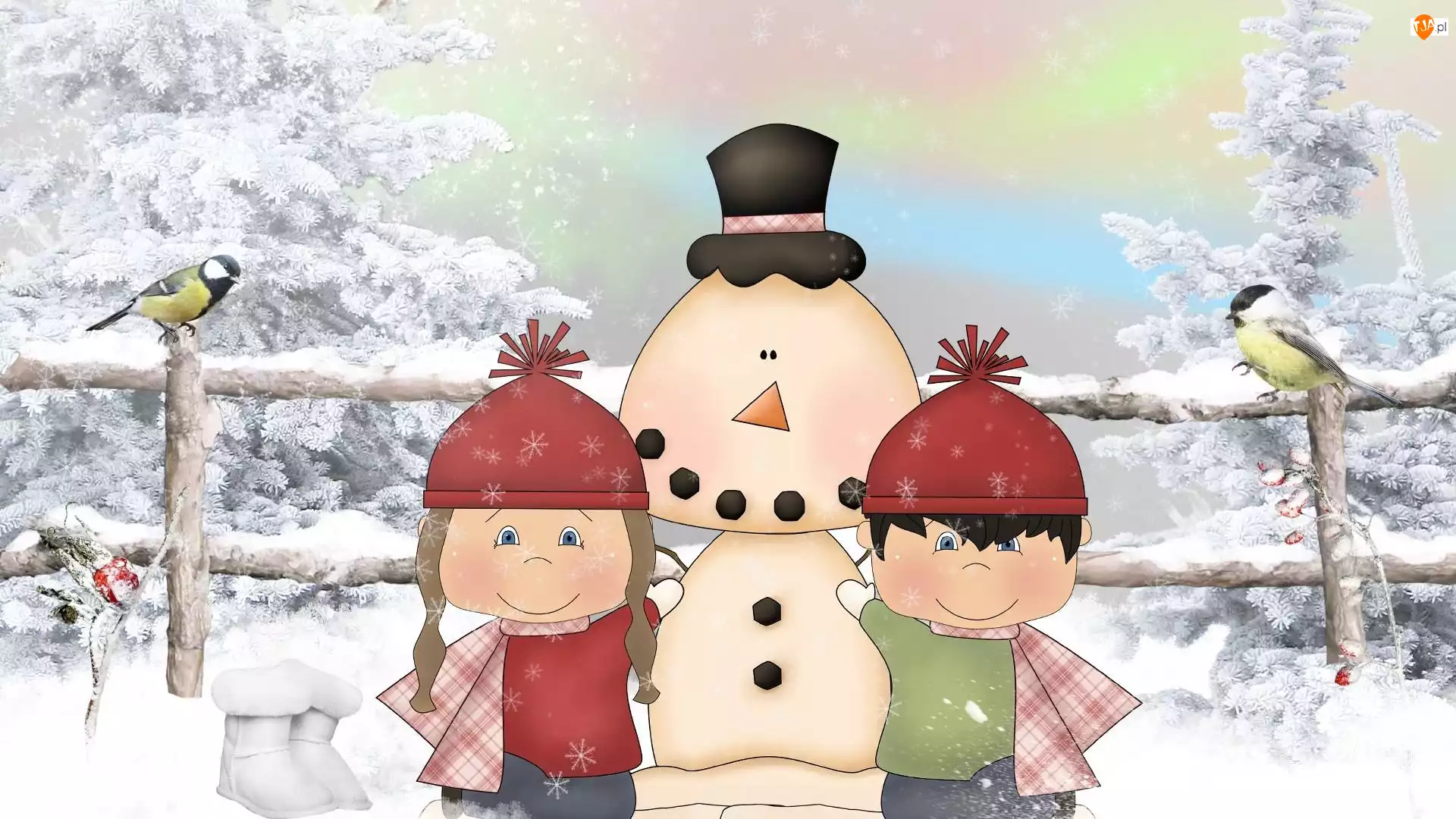 Zima, Dzieci, Śnieg, Bałwan, Ptaki