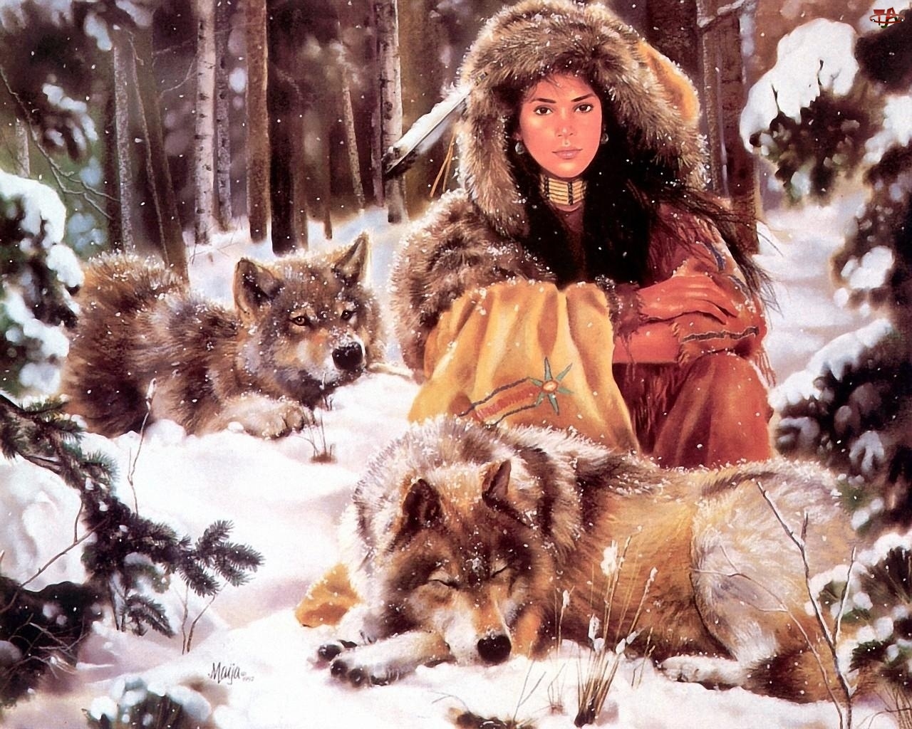 Zima, Dziewczyna, Indianka, Młoda, Wilki