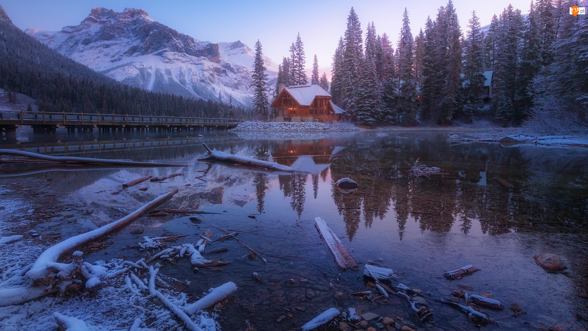 Zima, Góry, Drzewa, Most, Jezioro, Park Narodowy Yoho, Dom, Emerald Lake, Odbicie, Kanada