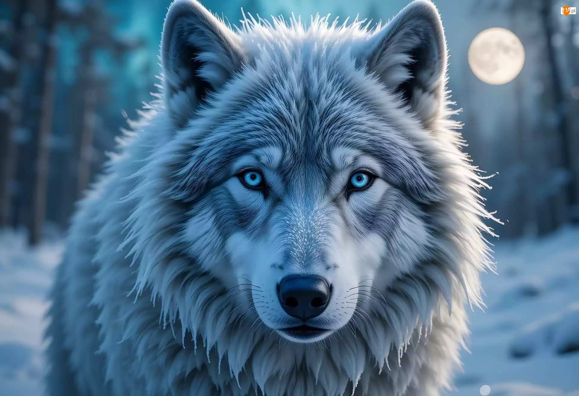 Zima, Grafika, Spojrzenie, Wilk, Księżyc