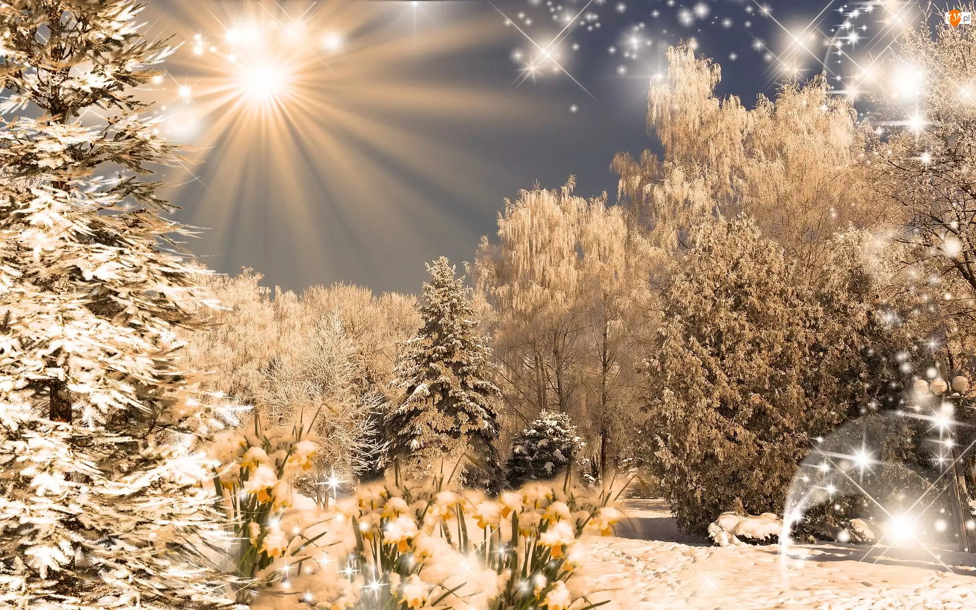 Zima, Lasy, Promienie, Drzewa, Słońca