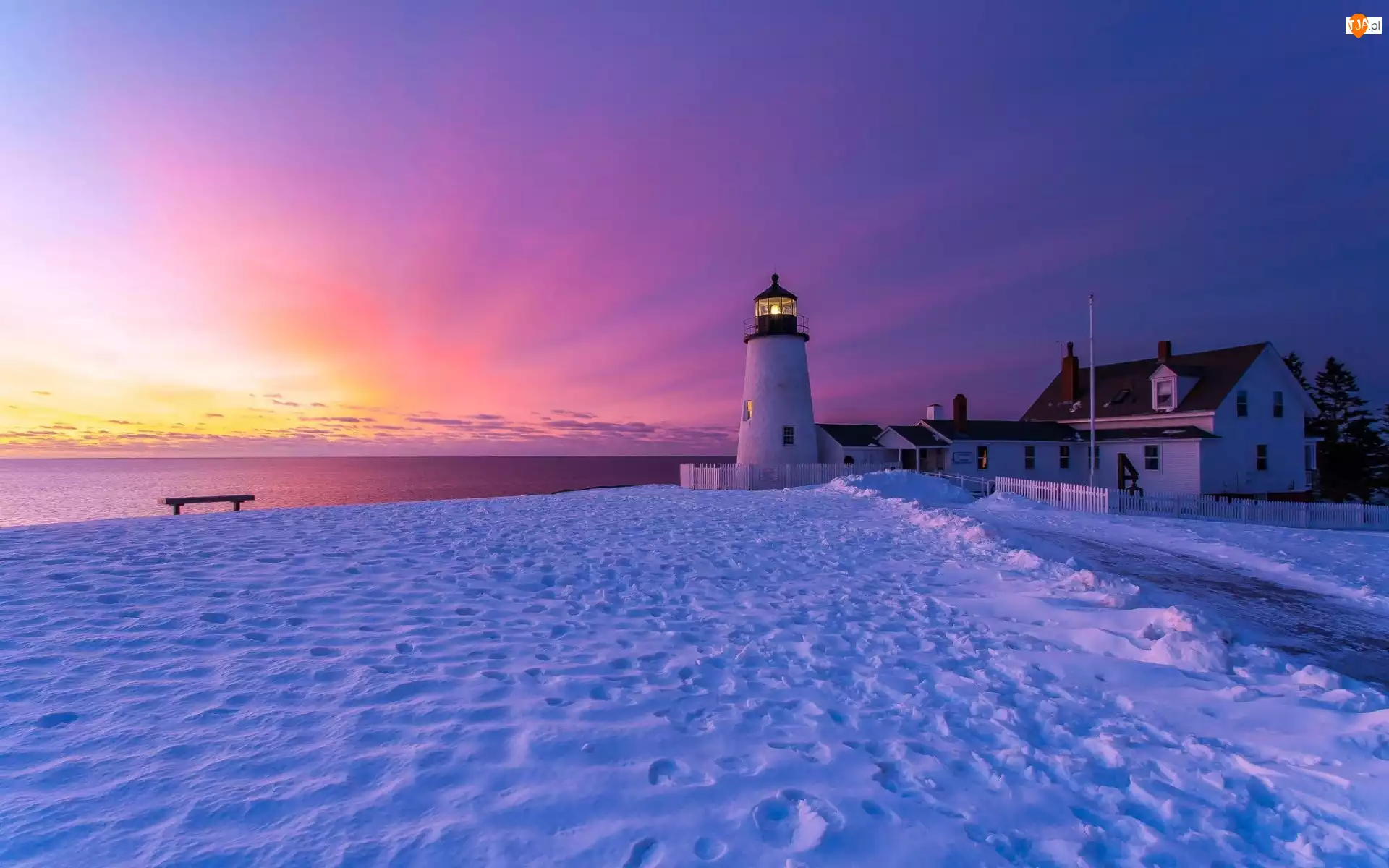 Zima, Latarnia Morska, Morze, Ławka, Wschód Sło