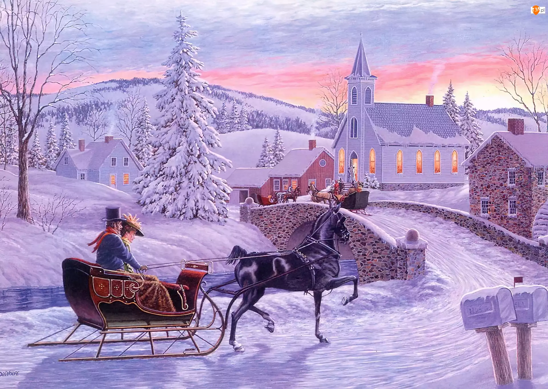 Zima, Malarstwo, Sanie, Kościół