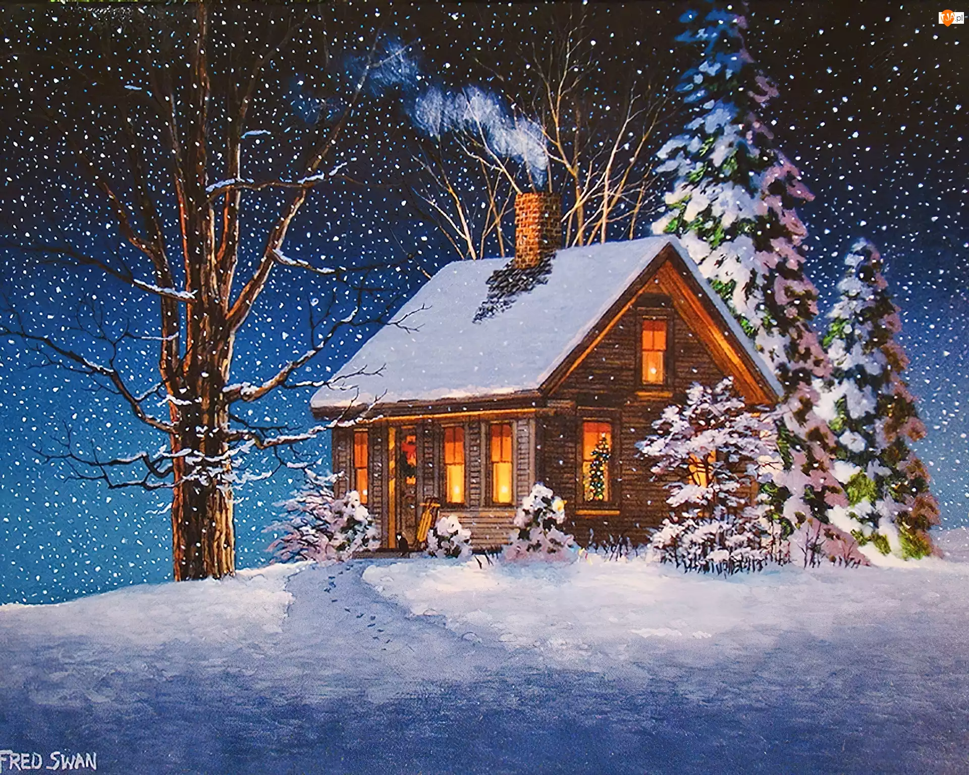 Zima, Narodzenie, Dom, Malarstwo, Choinka, Boże