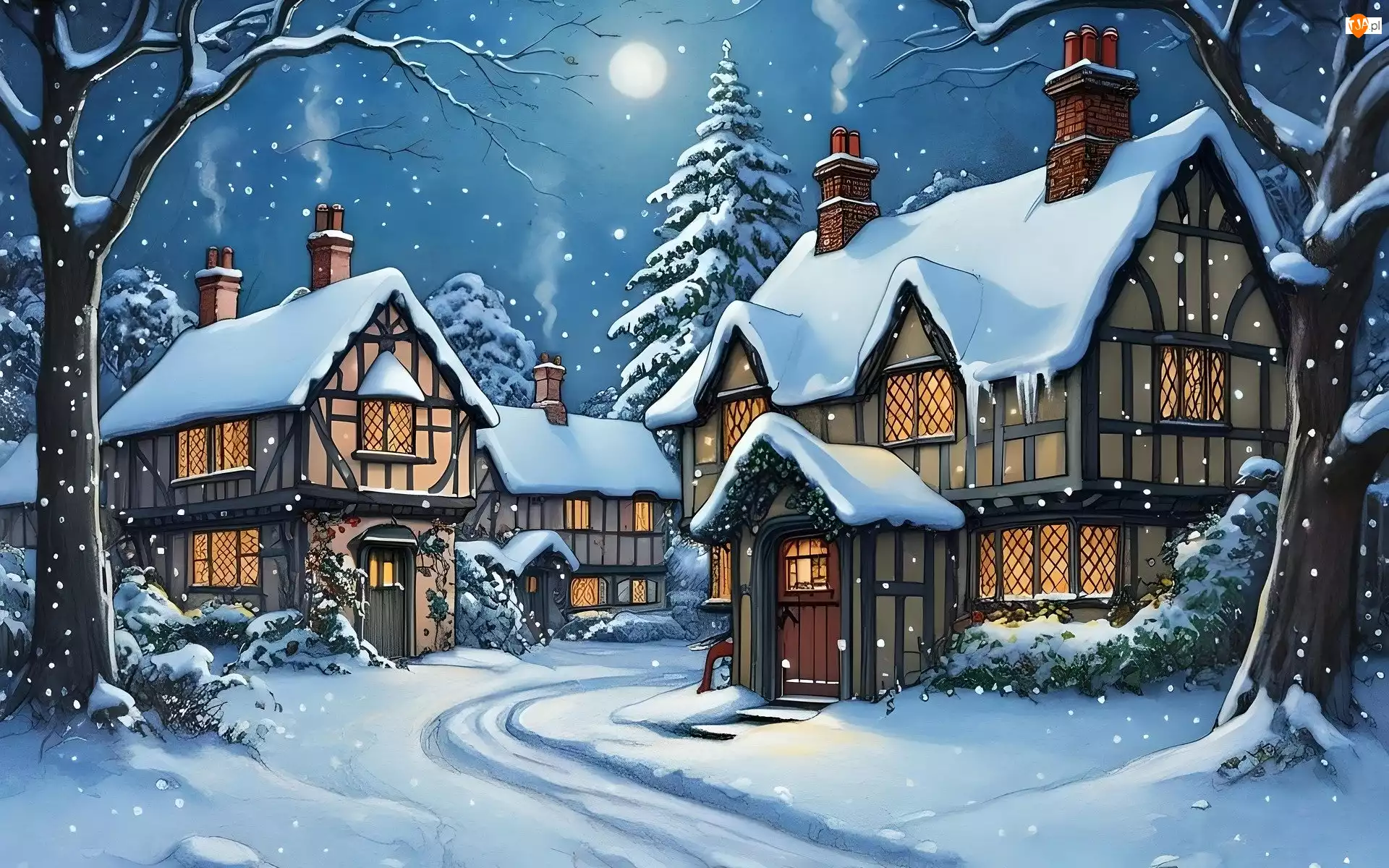 Zima, Ośnieżone, Droga, Grafika, Drzewa, Księżyc, Domy