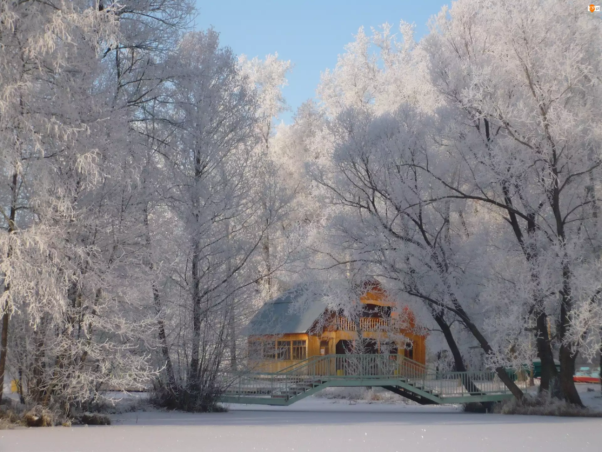 Zima, Park, Most, Dom, Rzeka