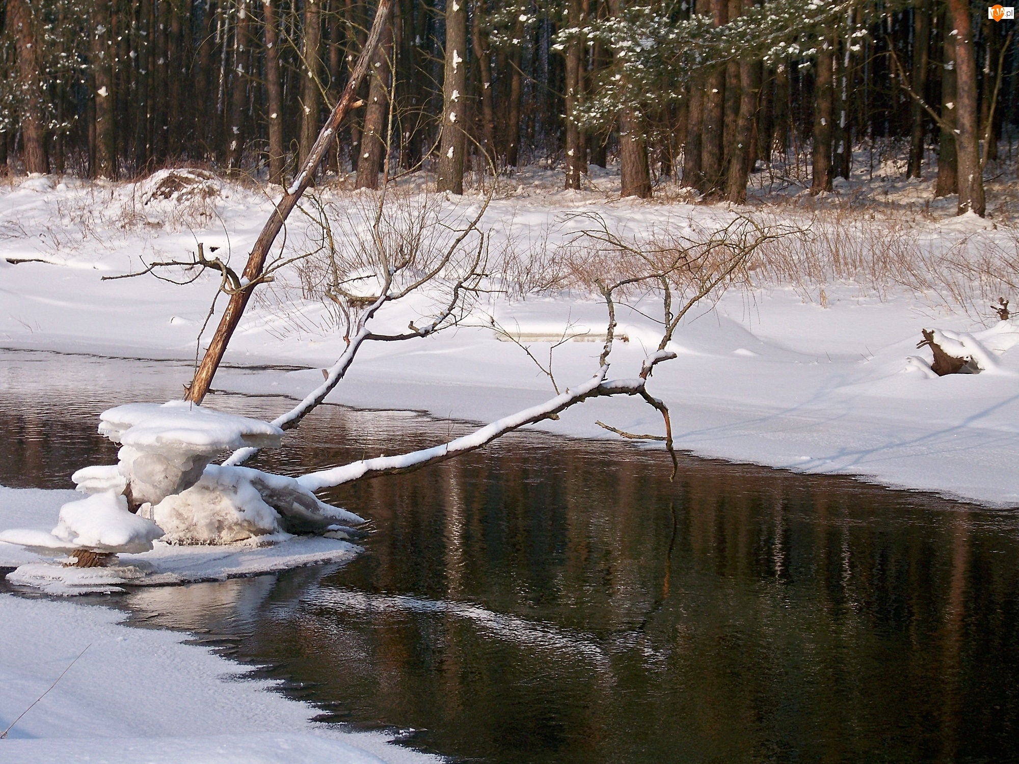 Zima, Rzeka, Śnieg, Drzewa