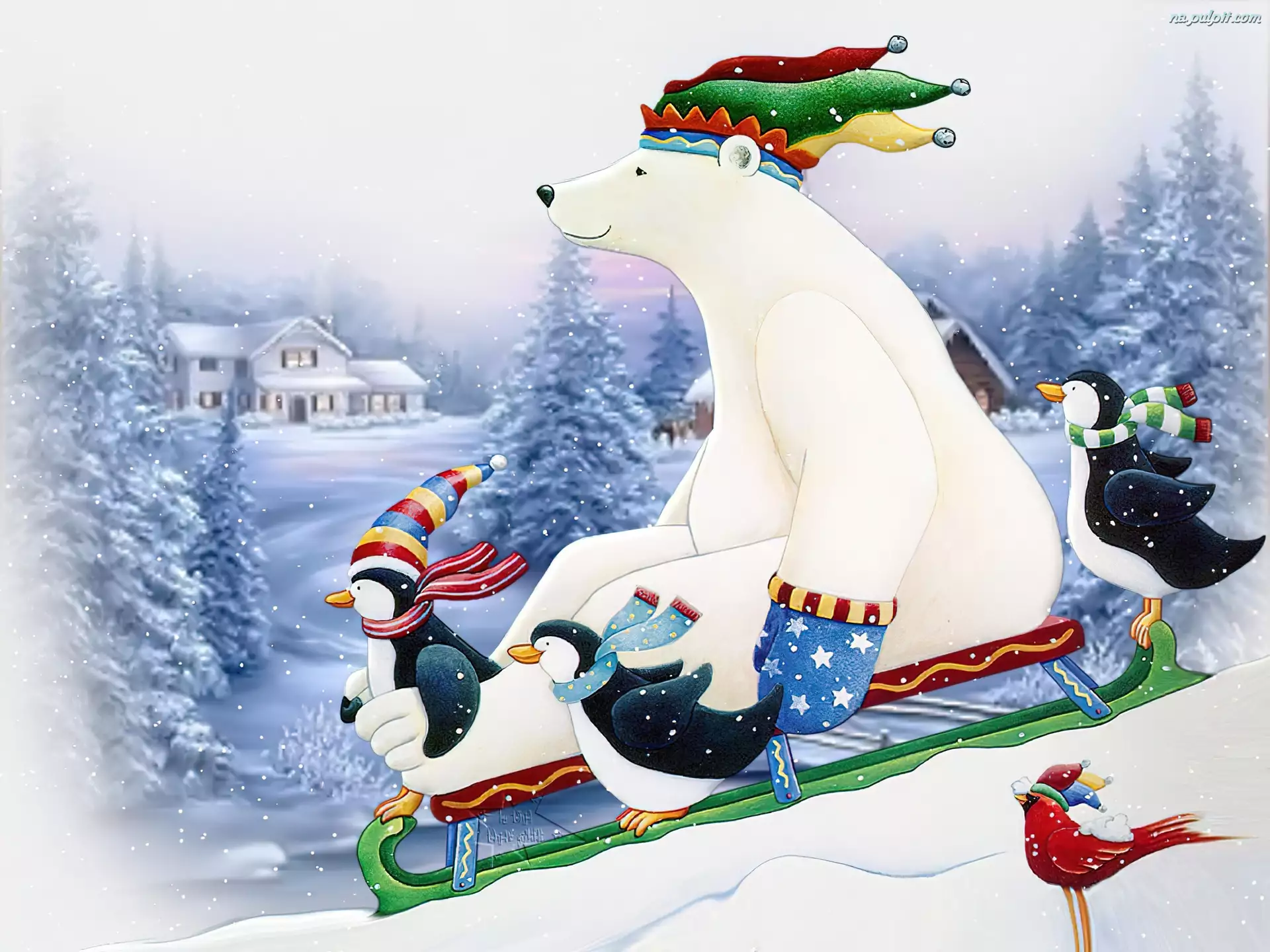 Zima, Sanie, Niedźwiedź, Pingwiny