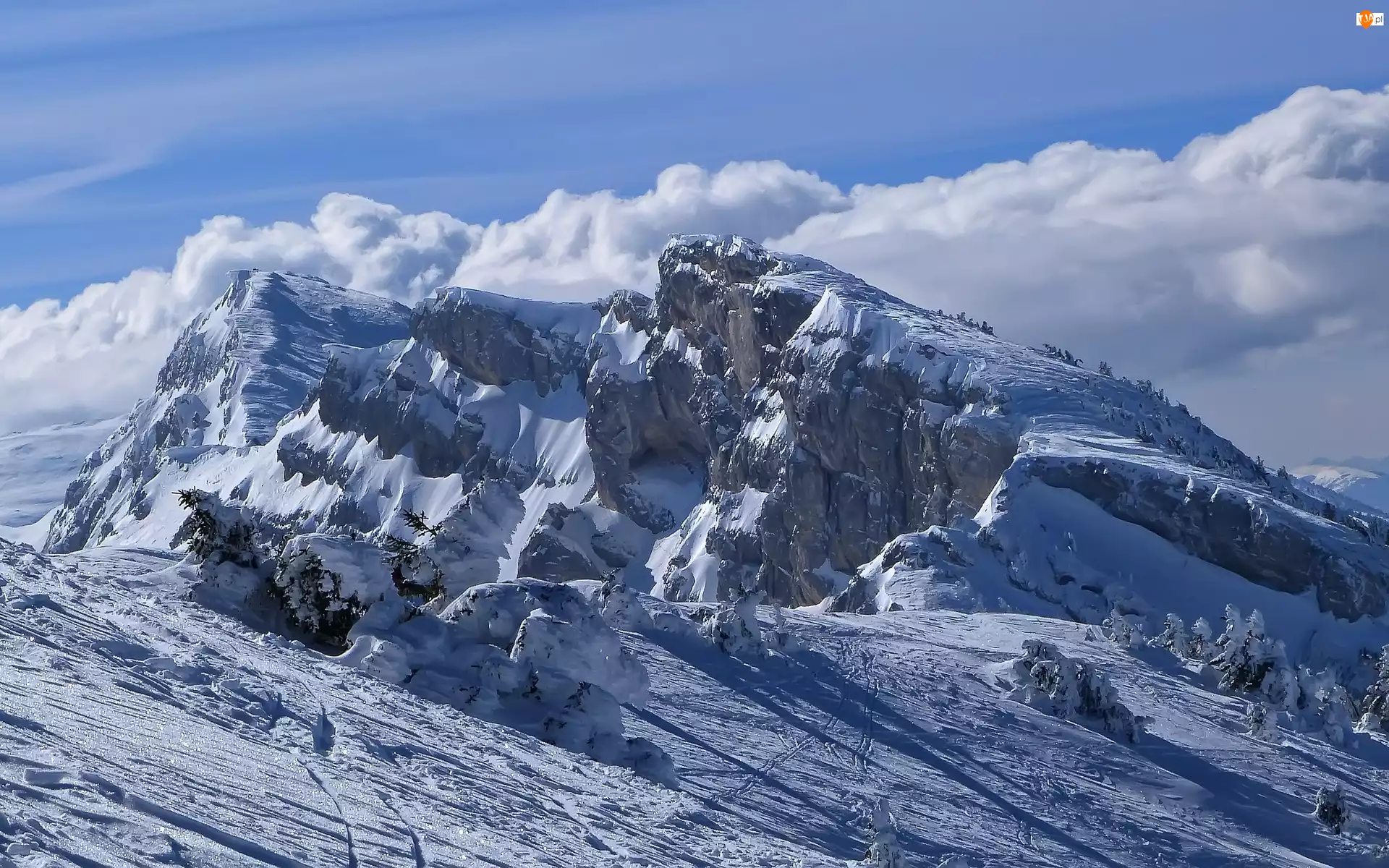 Zima, Skaliste, Drzewa, Góry, Chmury