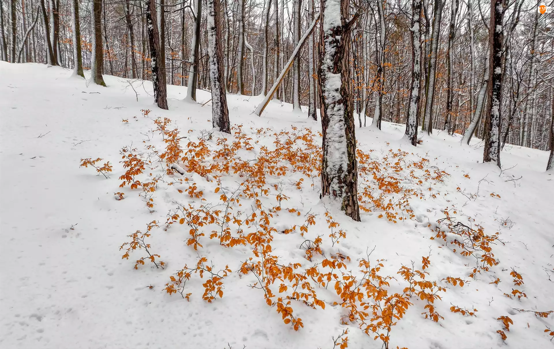 Pożółkłe. Liście, Zima, Drzewa, Las, Śnieg
