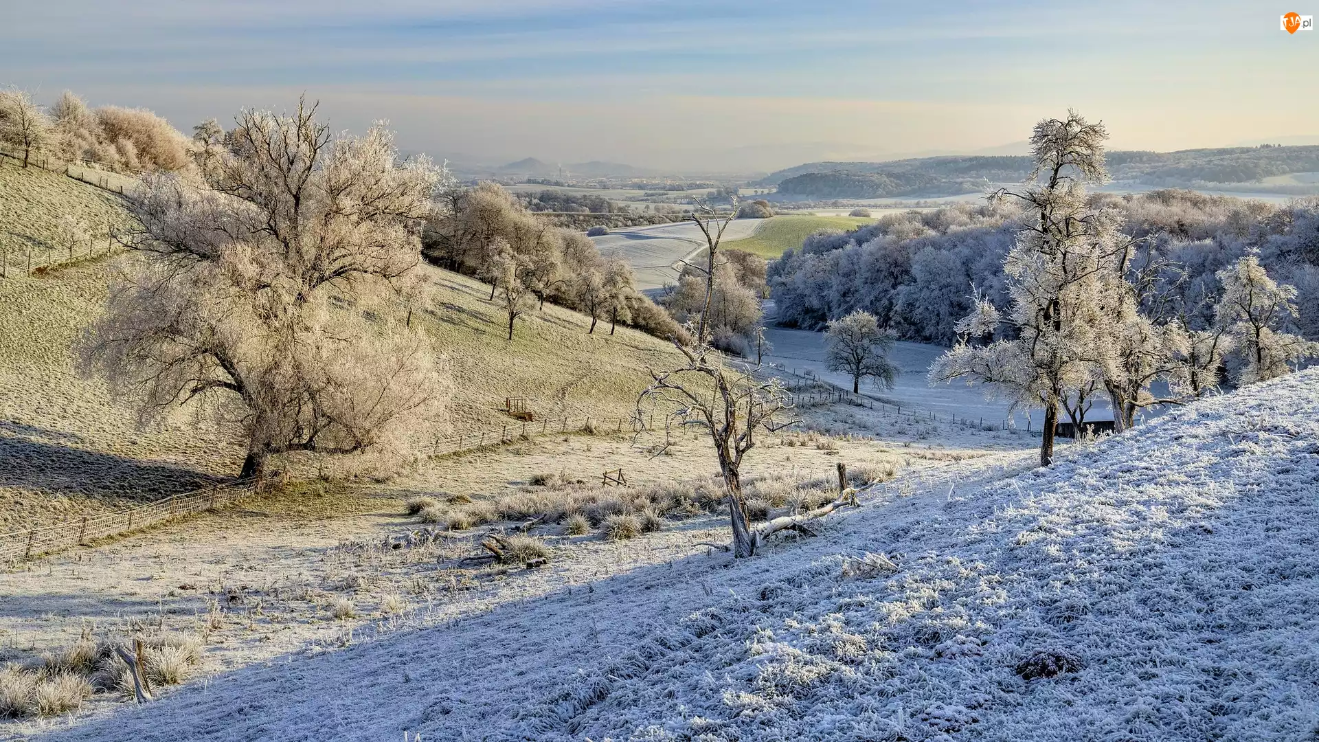 Zima, Wzgórza, Oszronione, Drzewa