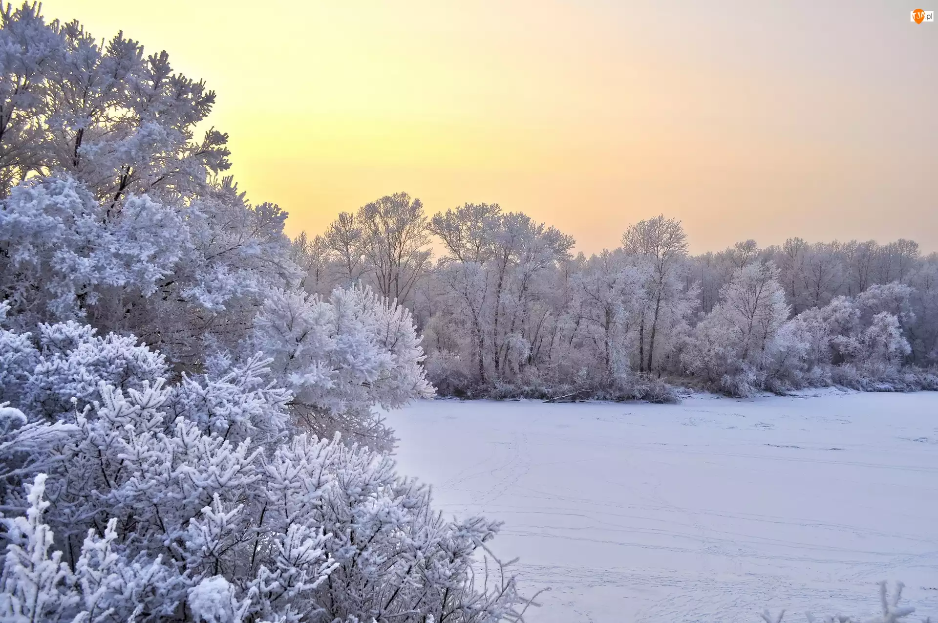 Zima, Zachód, Drzewa, Słońca, Śnieg