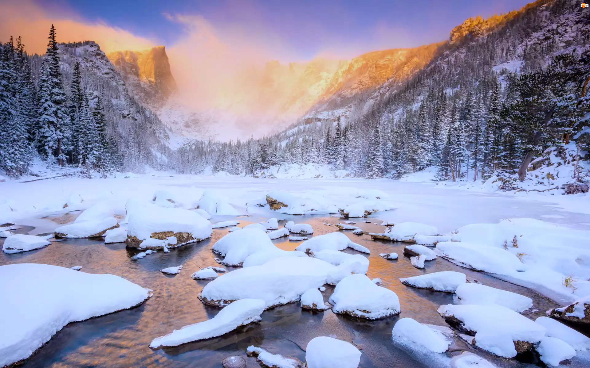 Zima, Zachód Słońca, Drzewa, Góry, Rzeka