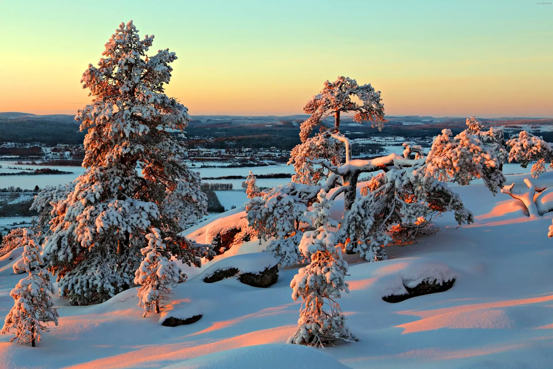 Zima, Zachód Słońca, Ośnieżone Drzewa, Krajob