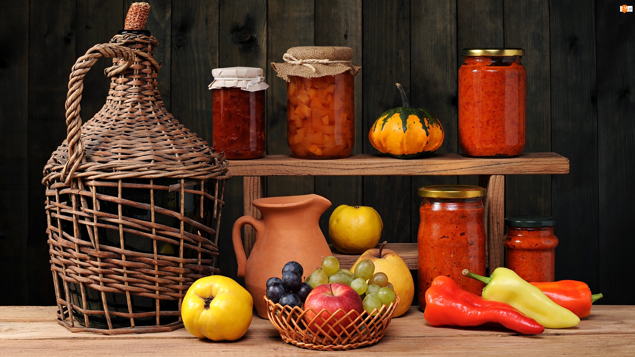 Butla, Papryczki, Wino, Winogrona, Warzywa, Owoce, Półka, Jabłka, Przetwory