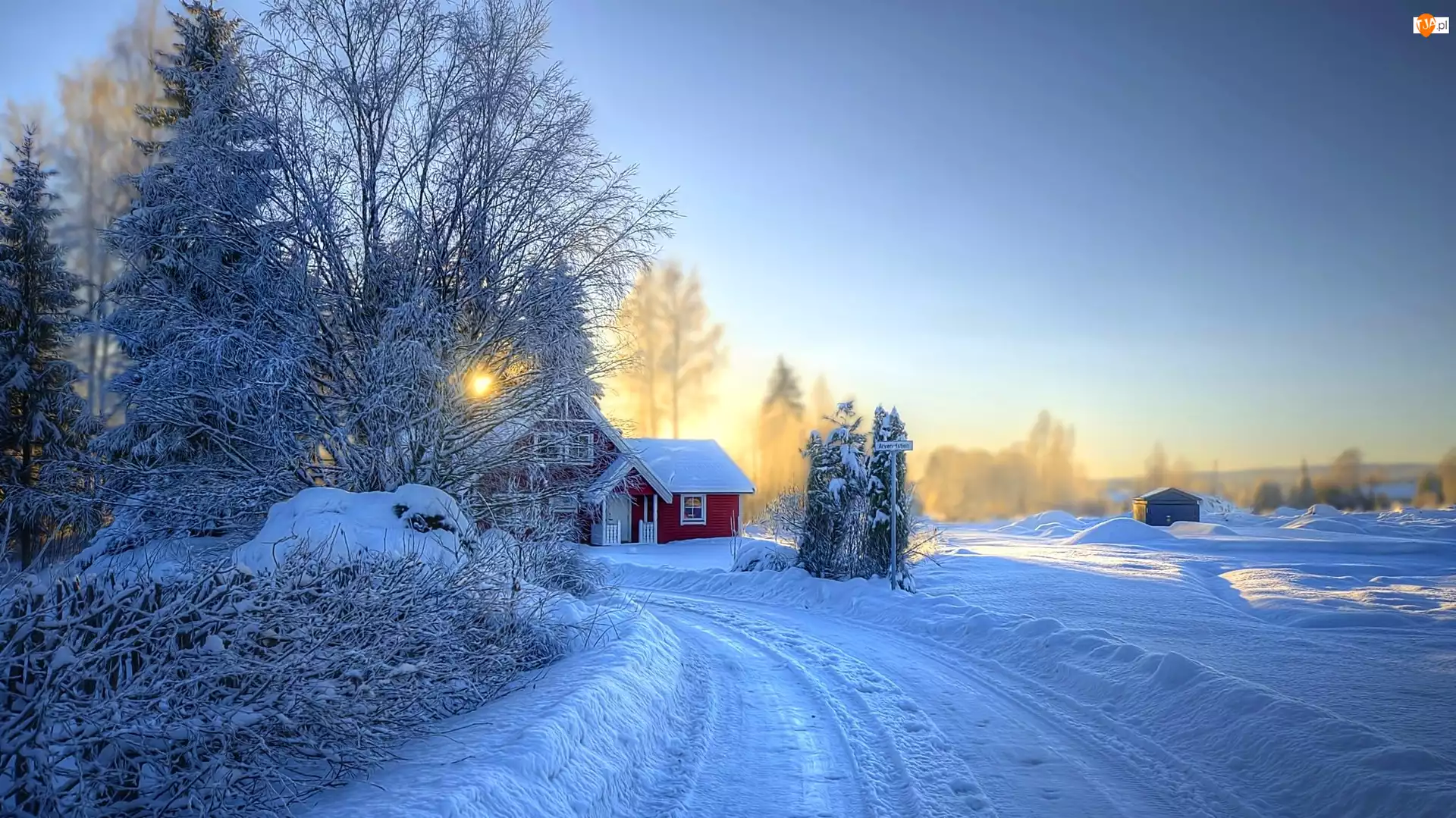 Dom, Pole, Zima, Drzewa, Droga, Wschód słońca