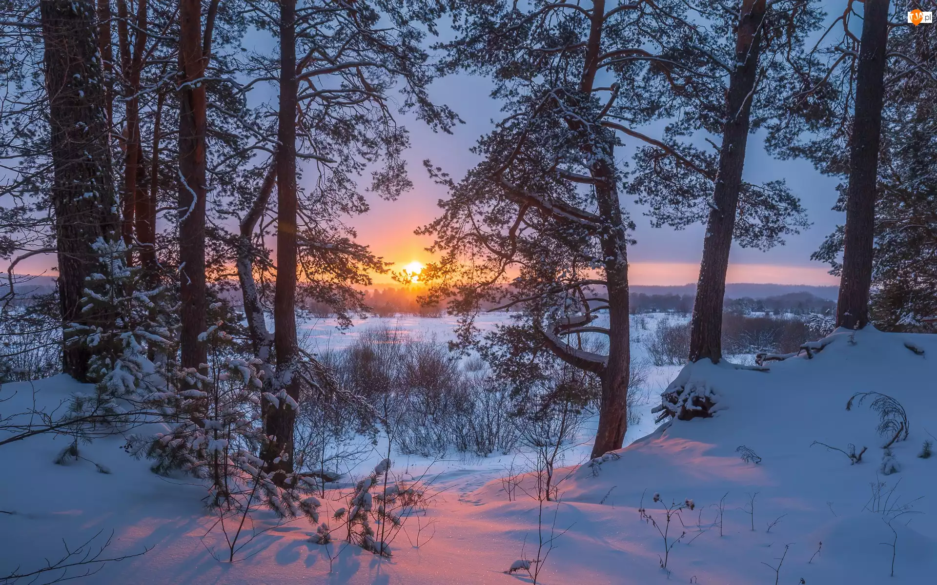 Słońce, Zachód słońca, Śnieg, Zima, Drzewa