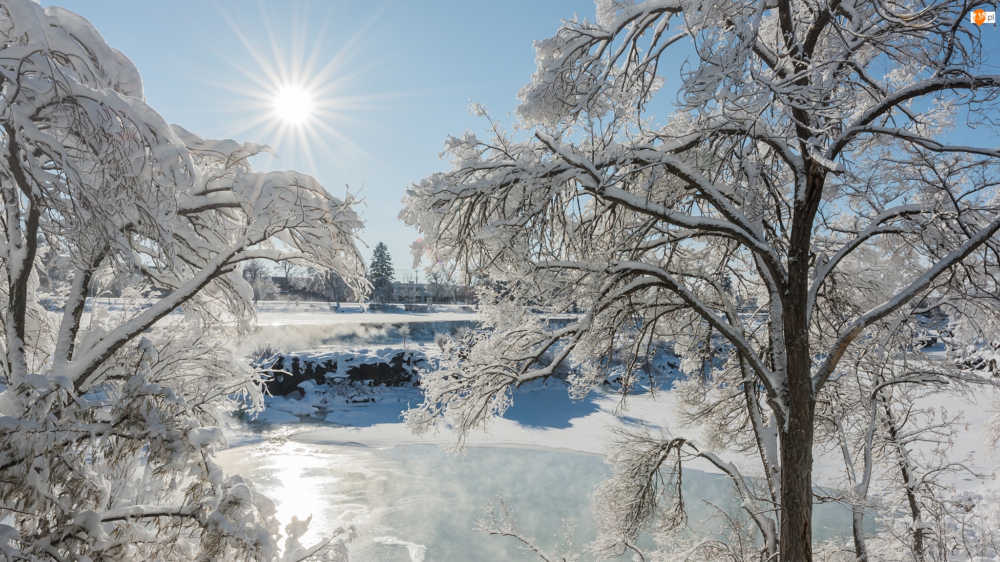 Rzeka, Promienie słońca, Śnieg, Zima, Drzewa