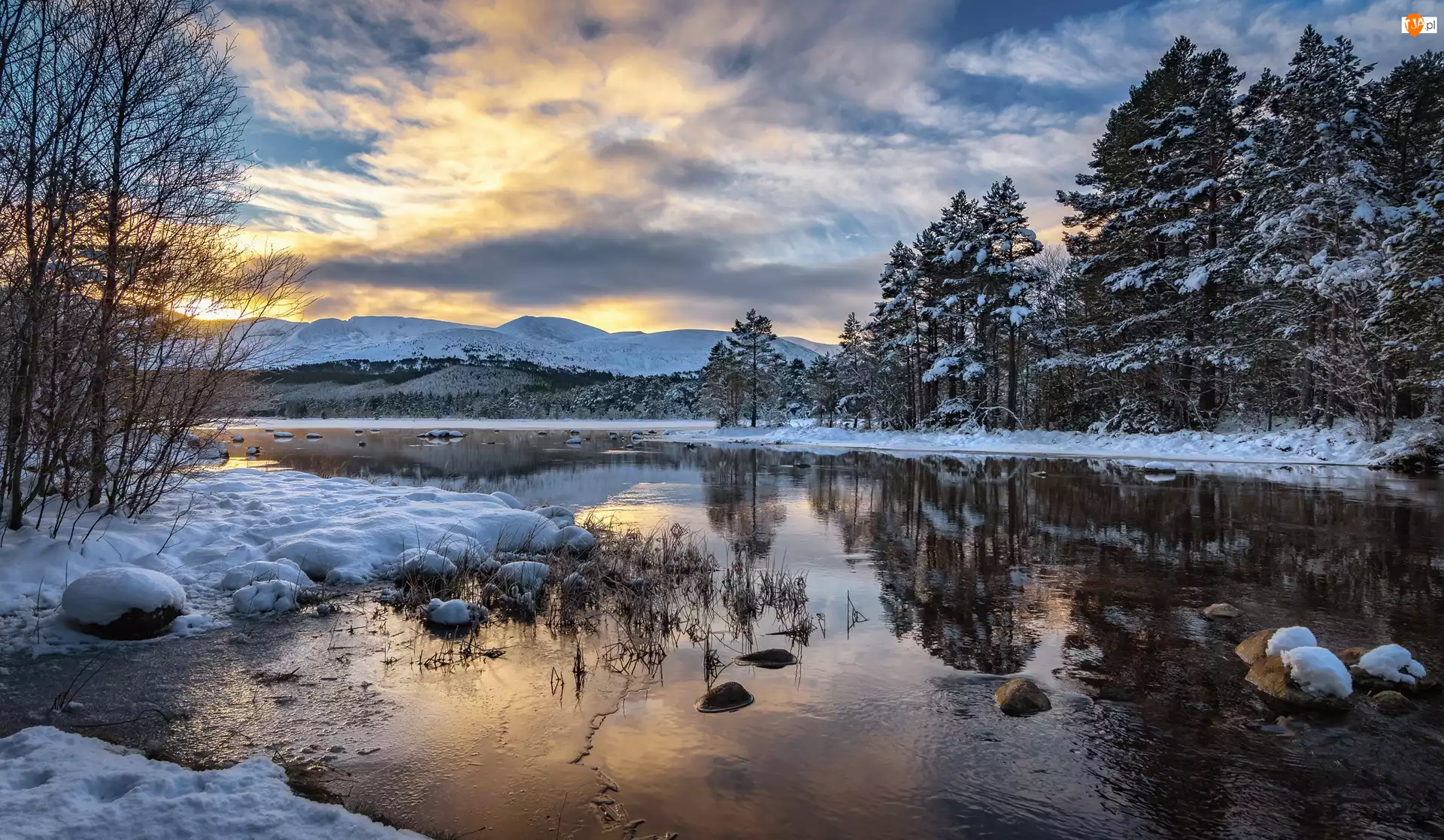 Jezioro, Góry, Drzewa, Chmury, Zima, Wschód słońca