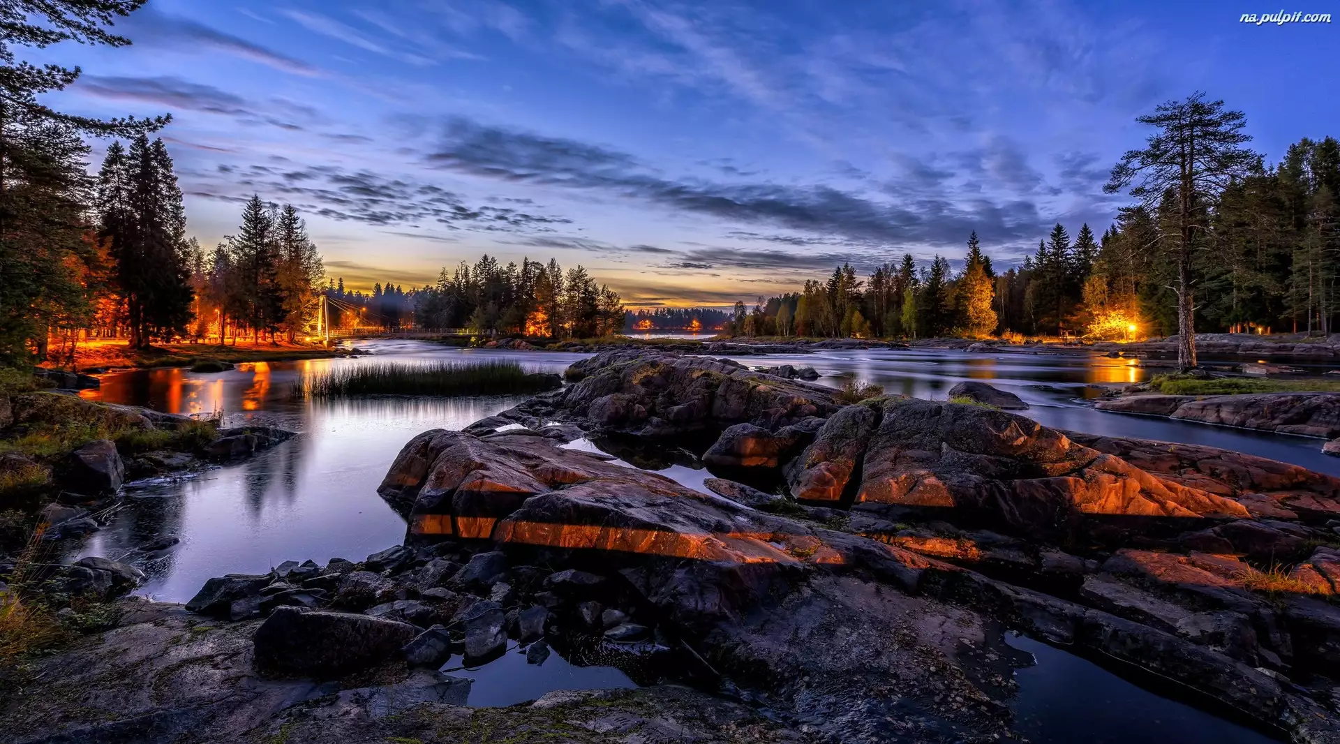 Zmierzch, Kamienie, Most, Rzeka, Światła