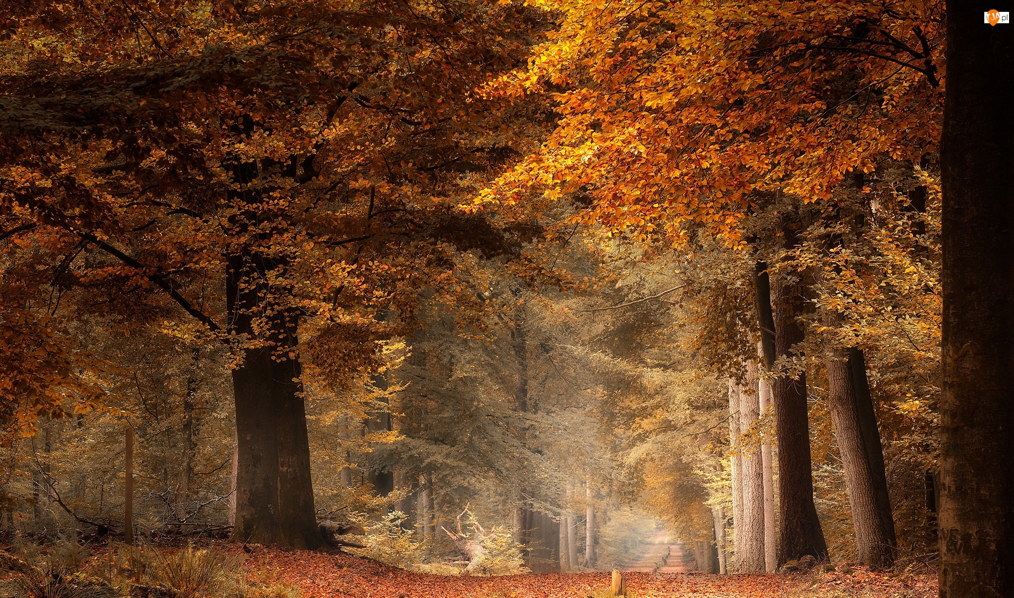 Las, Drzewa, Droga, Jesień, Brązowe, Żółte, Liście