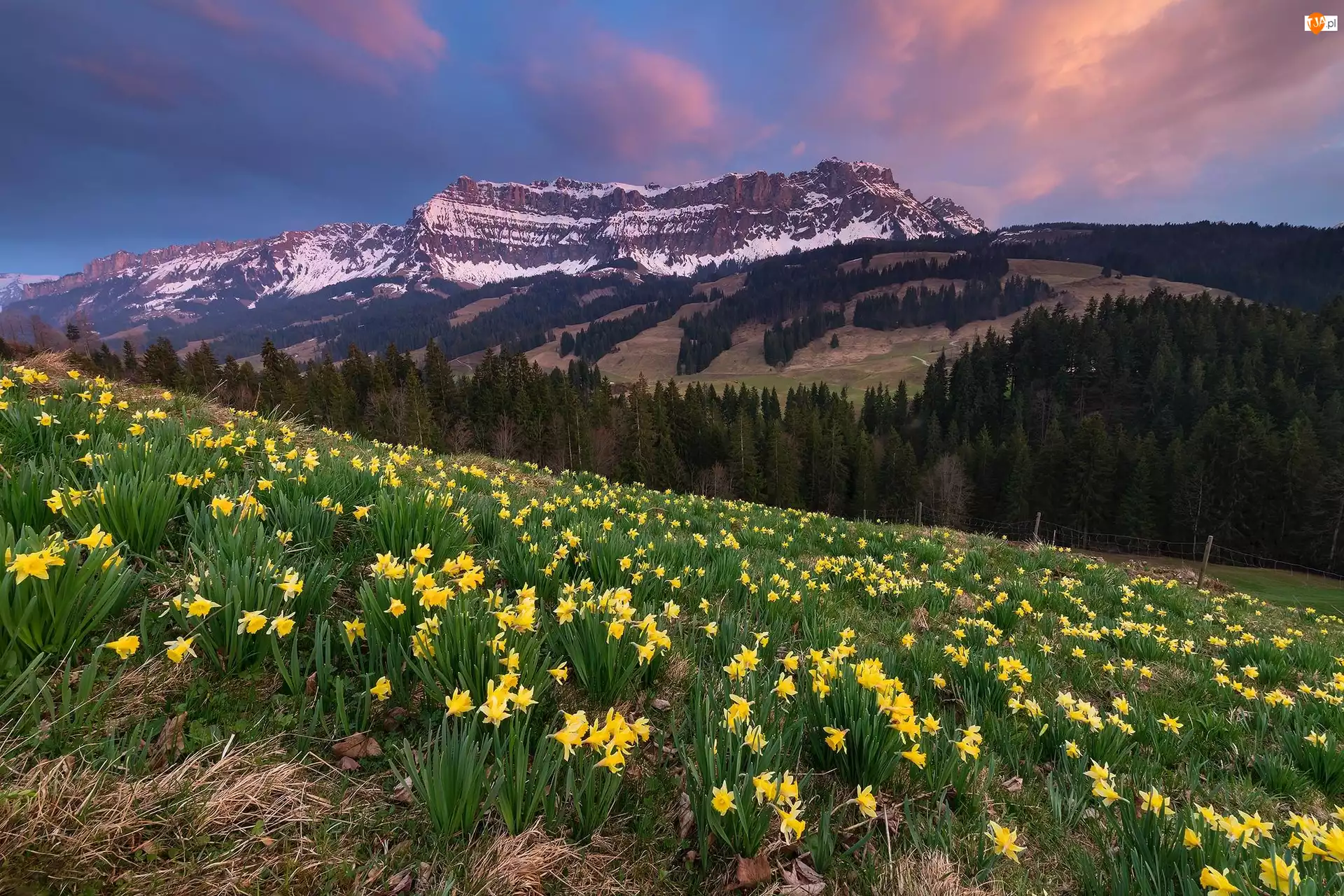Wzgórze, Narcyzy żonkile, Chmury Łąka, Wiosna, Góry, Las, Łąka