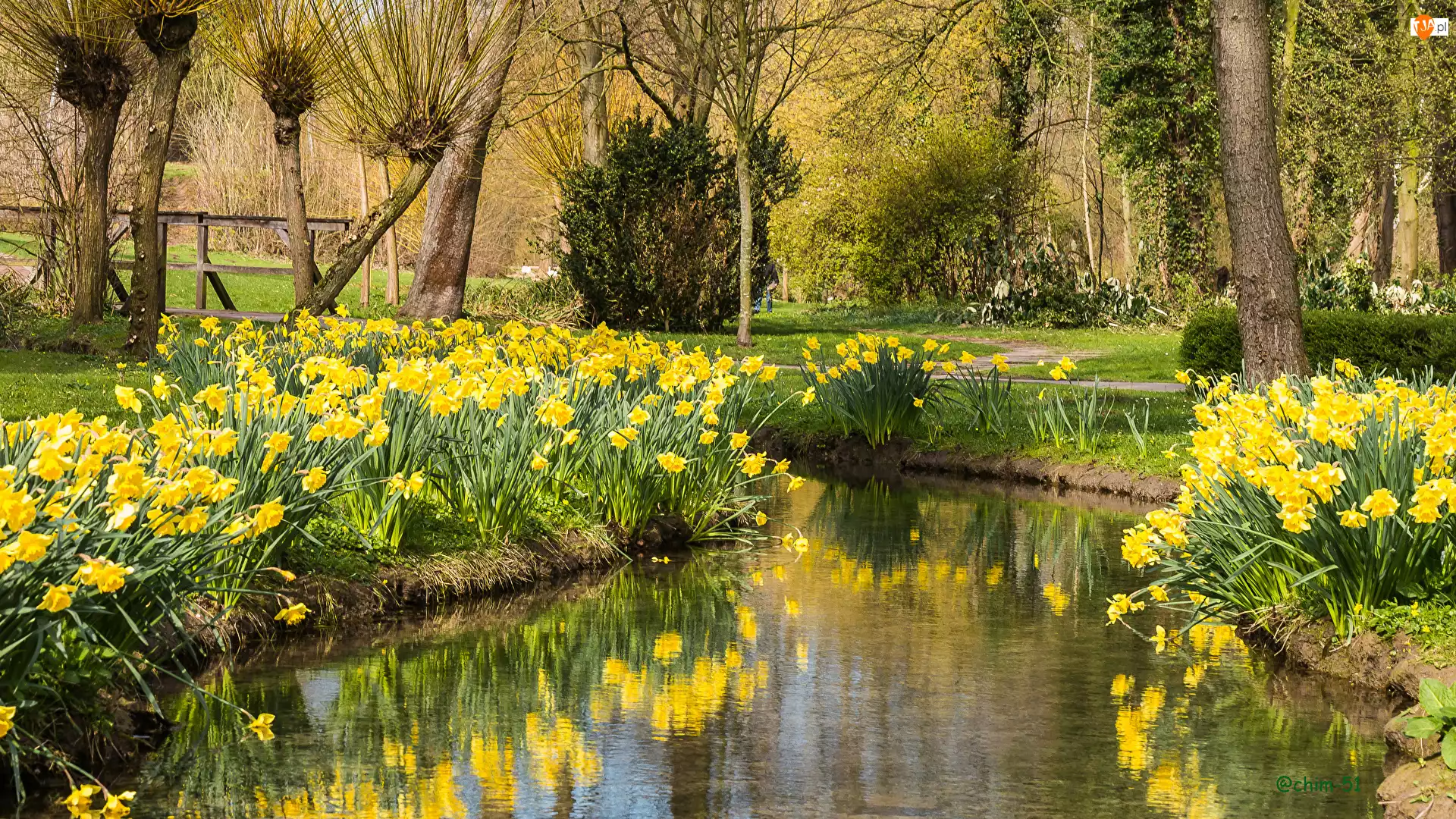 Strumyk, Drzewa, Park, Wiosna, Narcyzy żonkile