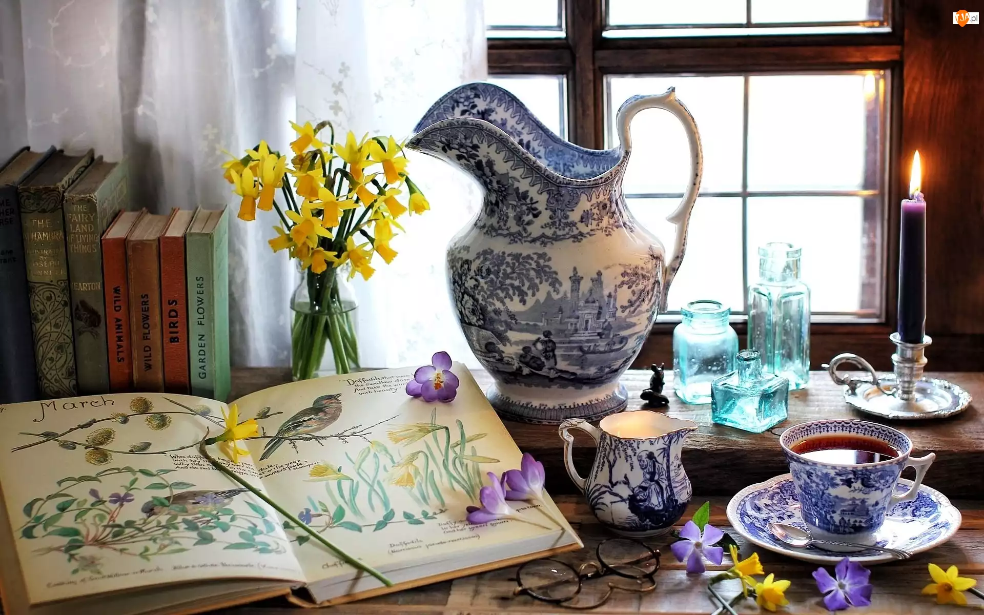 Żonkile, Świeczka, Krokusy, Książki, Herbata, Kompozycja, Bukiet, Dzbanek, Kwiaty