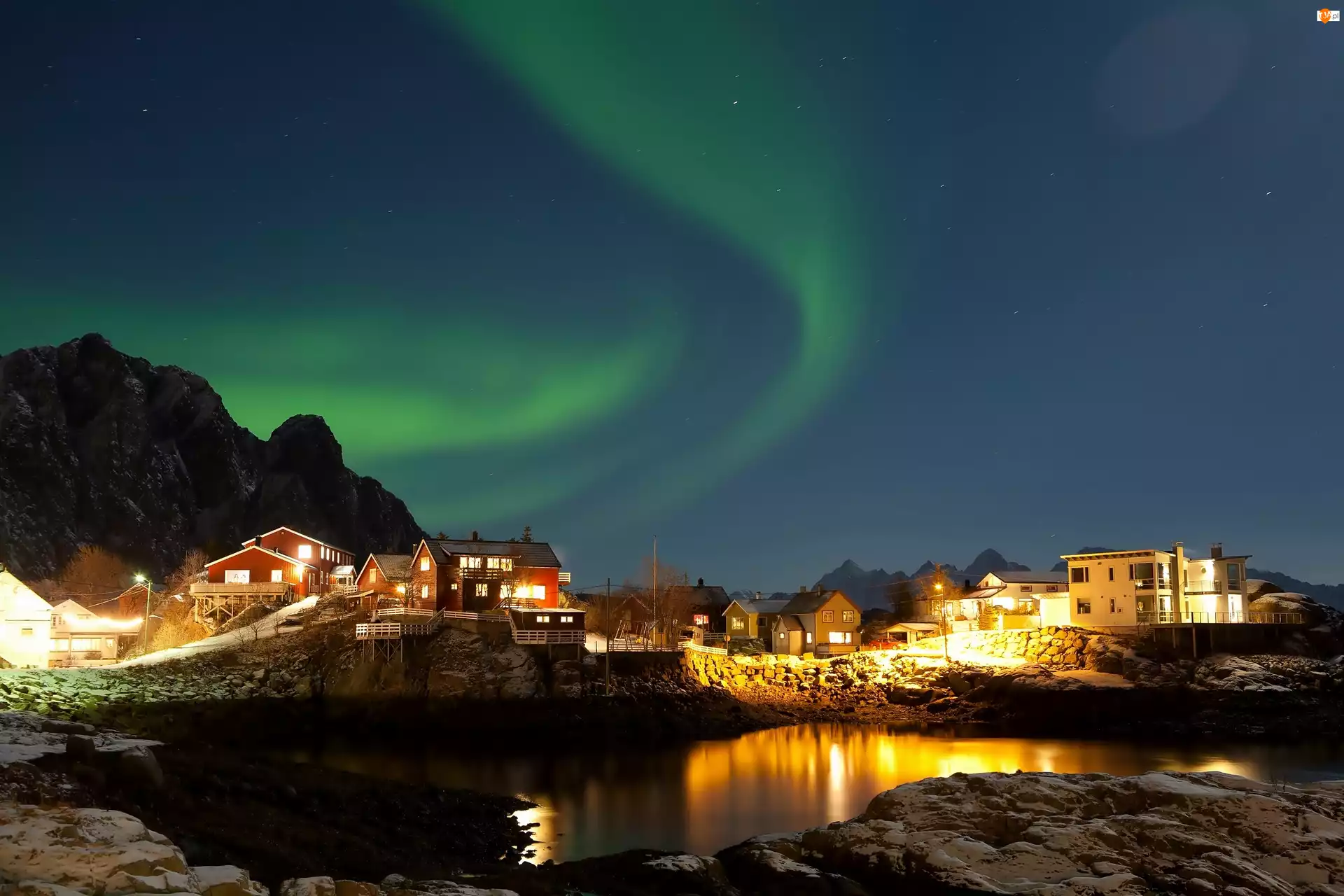 Zorza Polarna, Domy, Jezioro, Osada, Góry