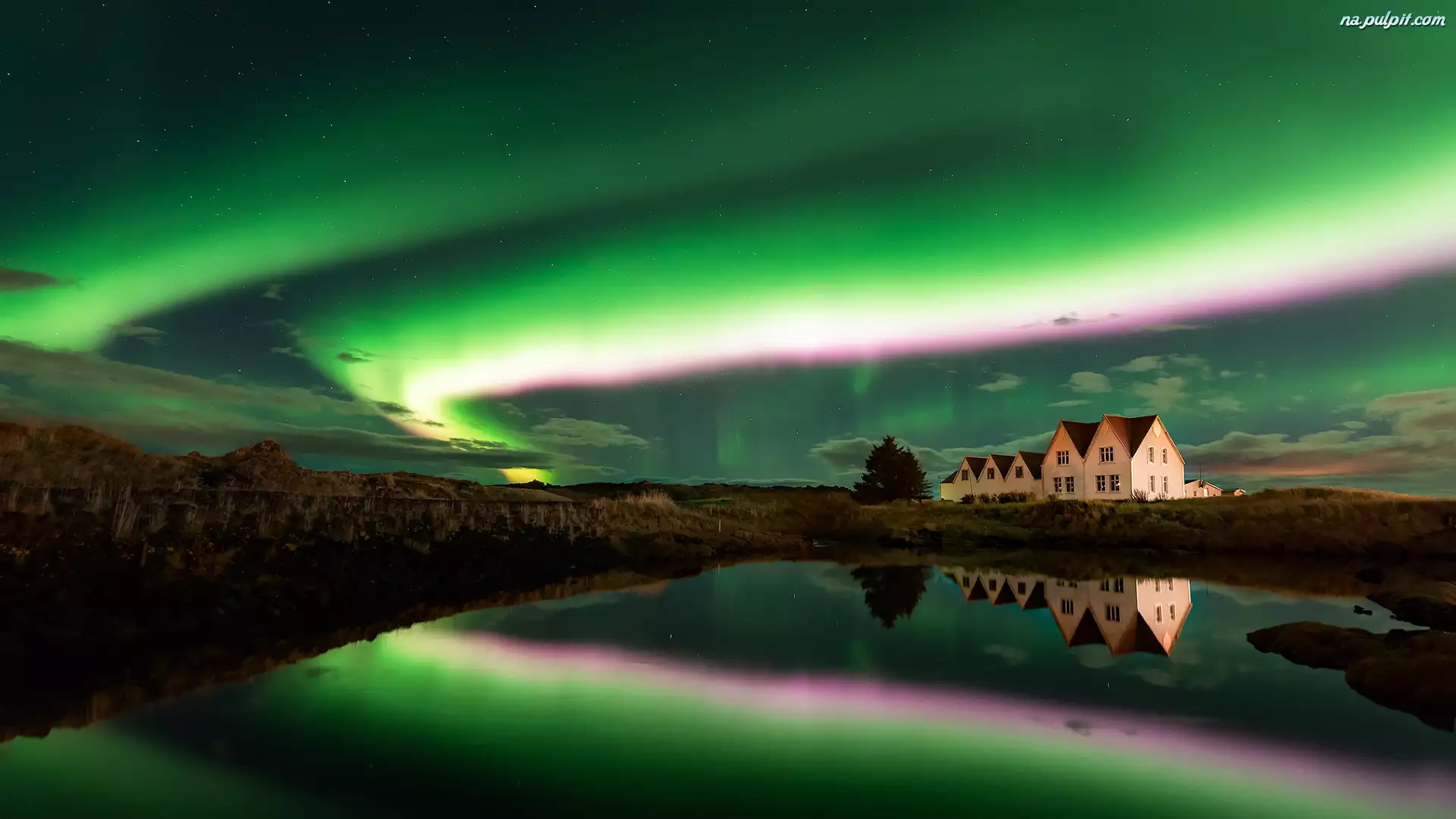 Domy, Zorza polarna, Odbicie, Islandia, Woda, Straumur
