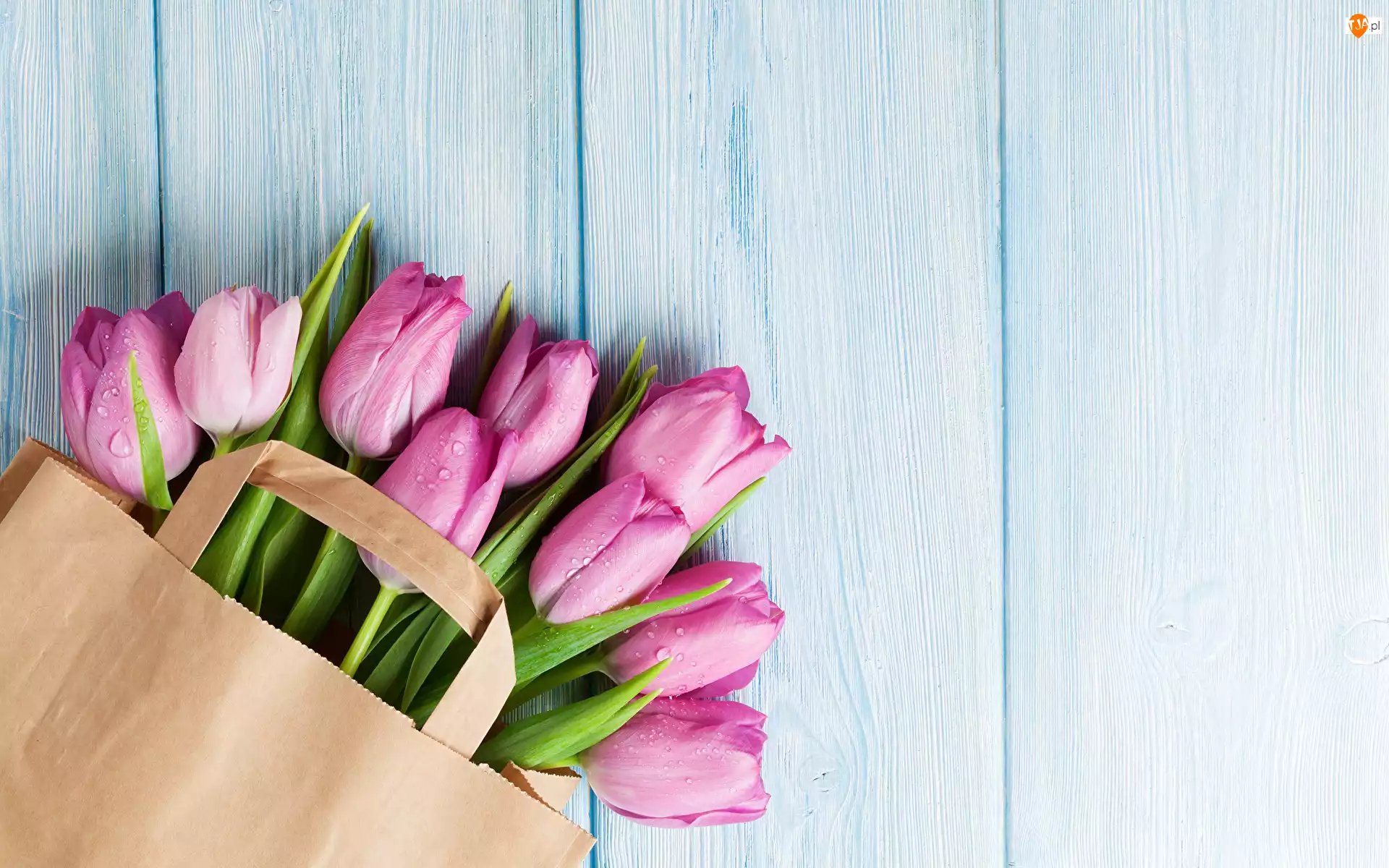 Jasnofioletowe, Kwiaty, Torba papierowa, Deski, Tulipany, Błękitne