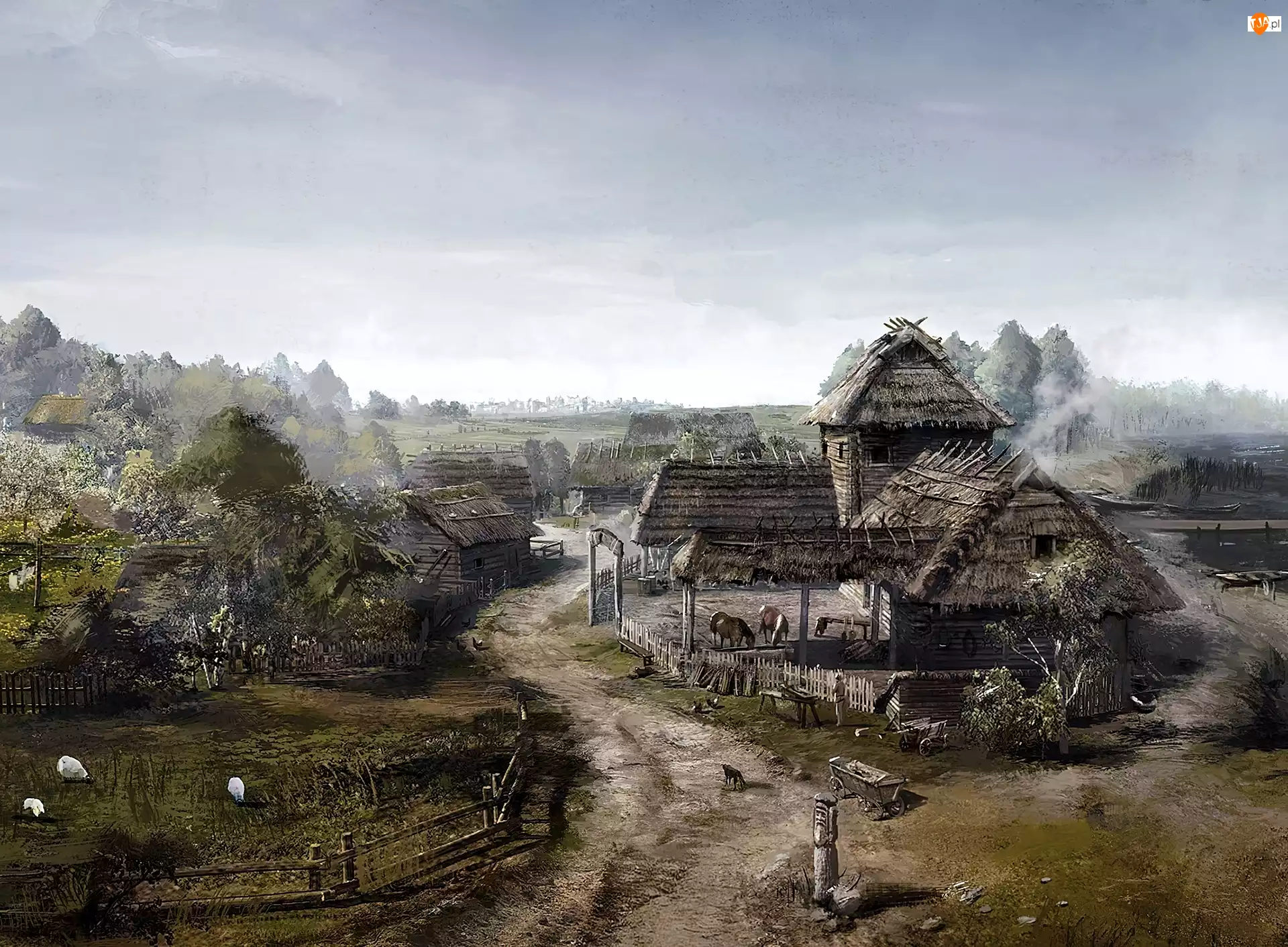 Zwierzęta, Malarstwo, Wieś, Obraz, Zabudowania